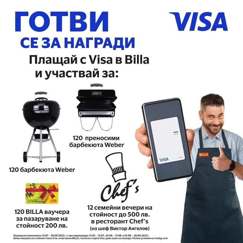 Пазарувай в магазини BILLA за минимум 5лв. , плати с твоята "Visa Card" и участвай в томболата за - Семейна вечеря в ресторанта на шеф Виктор Ангелов и още над 350 награди, с които сам/а да приготвиш вкусни рецепти 💥