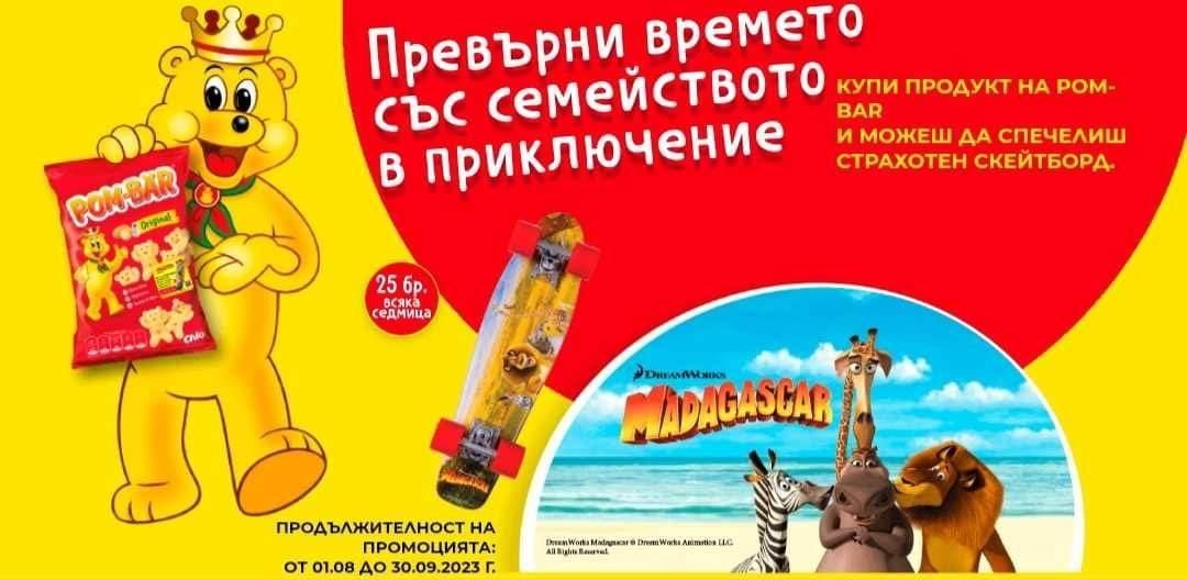 Купи продукт Pombar с промо стикер върху опаковката,  регистрирай кода от опаковката на сайта и участвай Всяка седмица за 1 от 225бр. Скейтборд Madagascar ( Всяка седмица по 25бр. ) 💥
