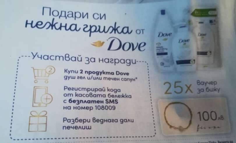 Купи 2 продукта Dove - душ гел и/или течен сапун , регистрирай кода ( номера ) на касовата бележка с безплатен SMS на номер 108009 и Разбери веднага дали печелиш 1 от 25бр. Ваучер за бижу на стойност 100лв. 🥳