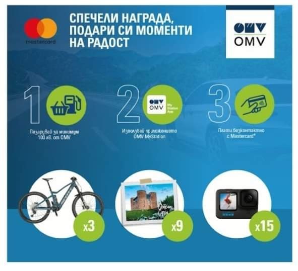 Пазарувай за минимум 100лв. от OMV , използвай приложението "OMV MyStation" , плати безконтактно с MasterCard и участвай в томболата за: