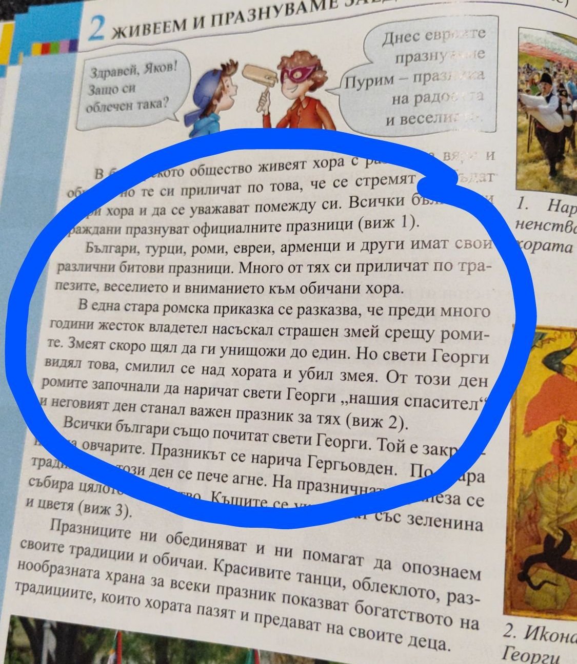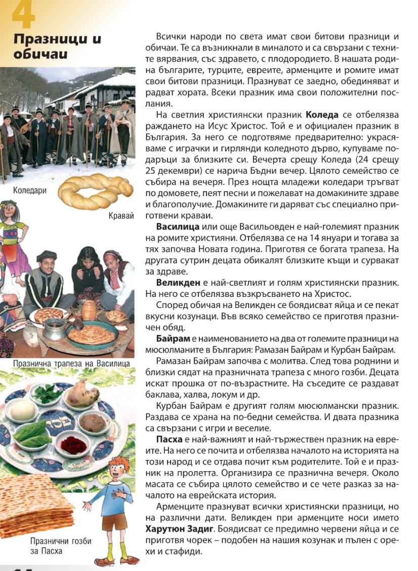 В учебника на клет е още по-широко застъпено, даже се обяснява повече за чуждите празници (ромската Василица, байряма и тн.), отколкото за нашите. Аз го намирам за проблем. Може да се спомене, че има различни религии, етноси и начини на празнуване, но чак толкова детайли ми идват в повече. Ние не сме учили такива неща на тази възраст. Не го намирам за редно, толерантността ми идва в повече и не ми е проблем да си го призная. Ако искам детето ми да учи за религии, ще го пратя на такъв час.