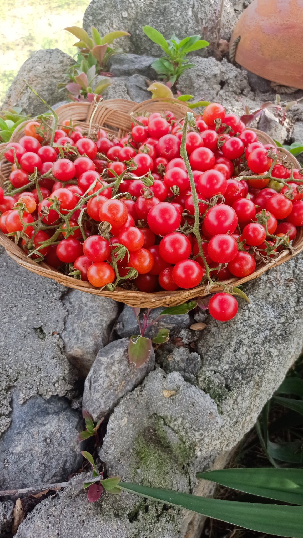 И защото нямам в кавички работа днес реших да обера чери доматките.Радвах им се.Като черешки са.Сложих ги в сушилнята да се сушат.