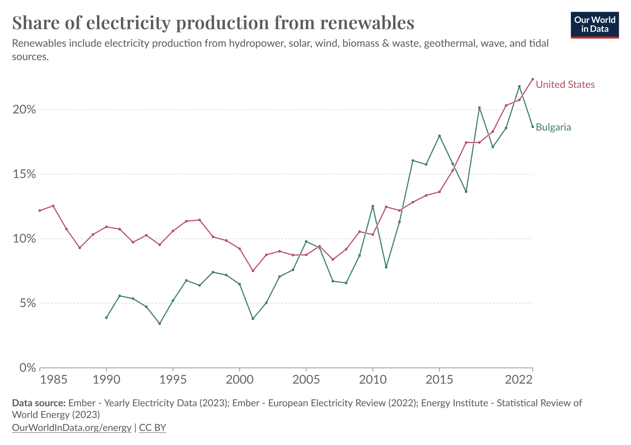 Източник на данните: Ember - Yearly Electricity Data (2023); Ember - European Electricity Review (2022); Energy Institute - Statistical Review of World Energy (2023), https://ourworldindata.org/grapher/share-electricity-renewables? … t&country=USA~BGR