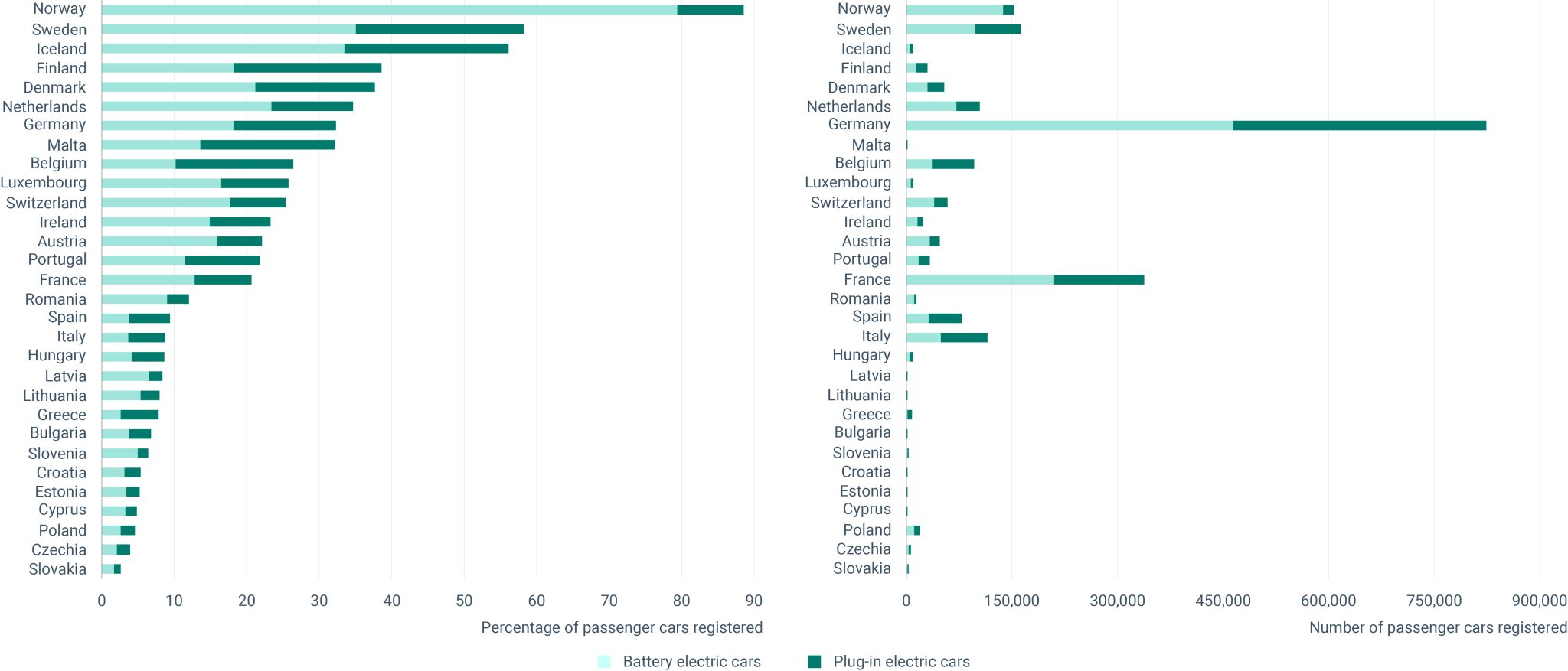 Източник на данните: Европейската агенция за околна среда - https://www.eea.europa.eu/data-and-maps/figures/new-electric-veh … cles-by-country-2