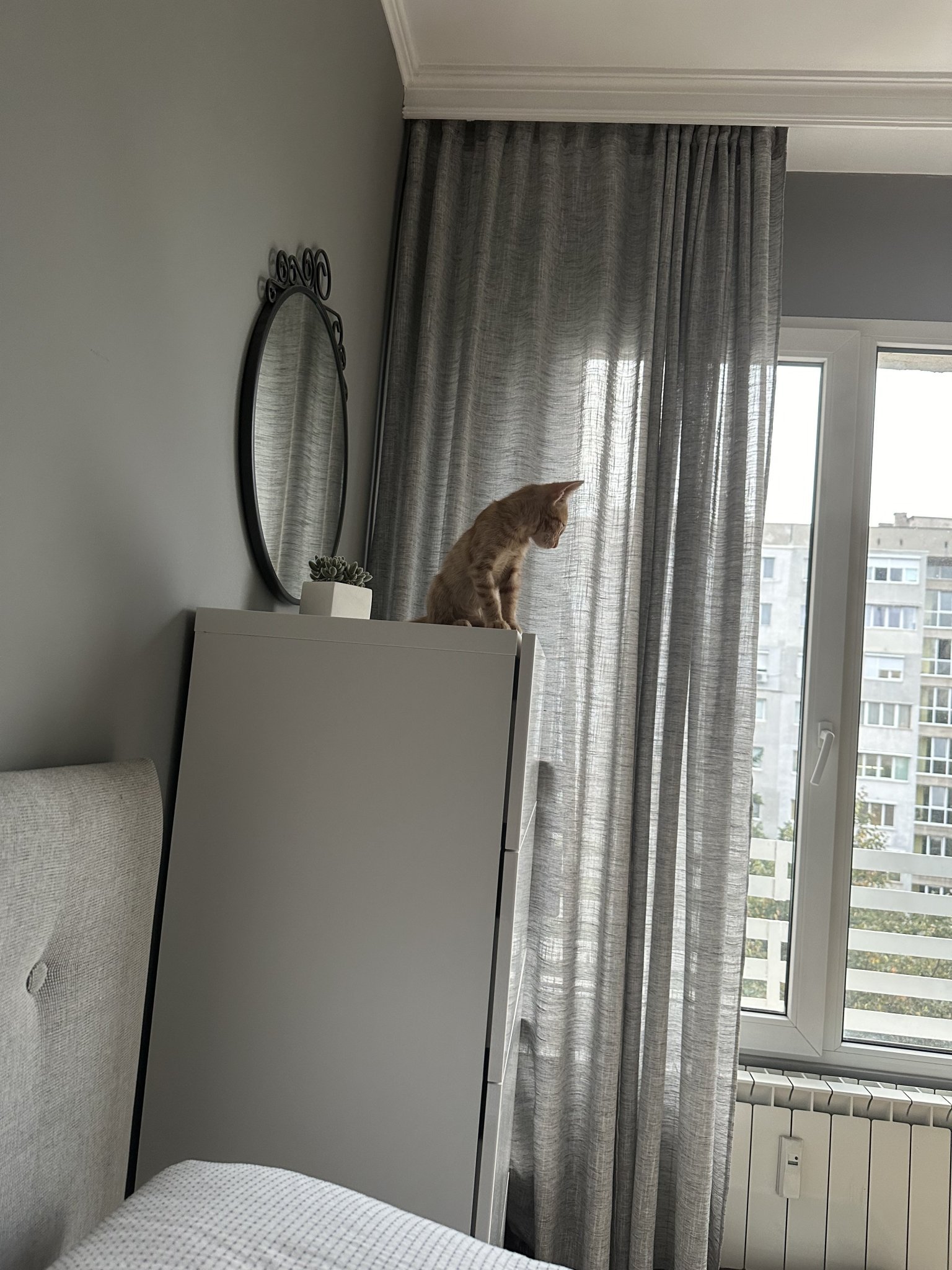 Като гледам къде се е качило... Нашият котарак е на 1 г и още не е 'посмял' да се качи на секцията. Simple Smile то няма откъде да се покатери всъщност. Оборудвай жилището с някакви полички да може котето и голямата котка да се катерят. Котките обичат да лежат на твърдо и на високо. Нашия се бои да стъпва в мекото легълце, което съм му купила. Също на драскалката има едно парче плат, уж да легне там като люлка, но не стъпва, бои се, хем не е високо и да падне.