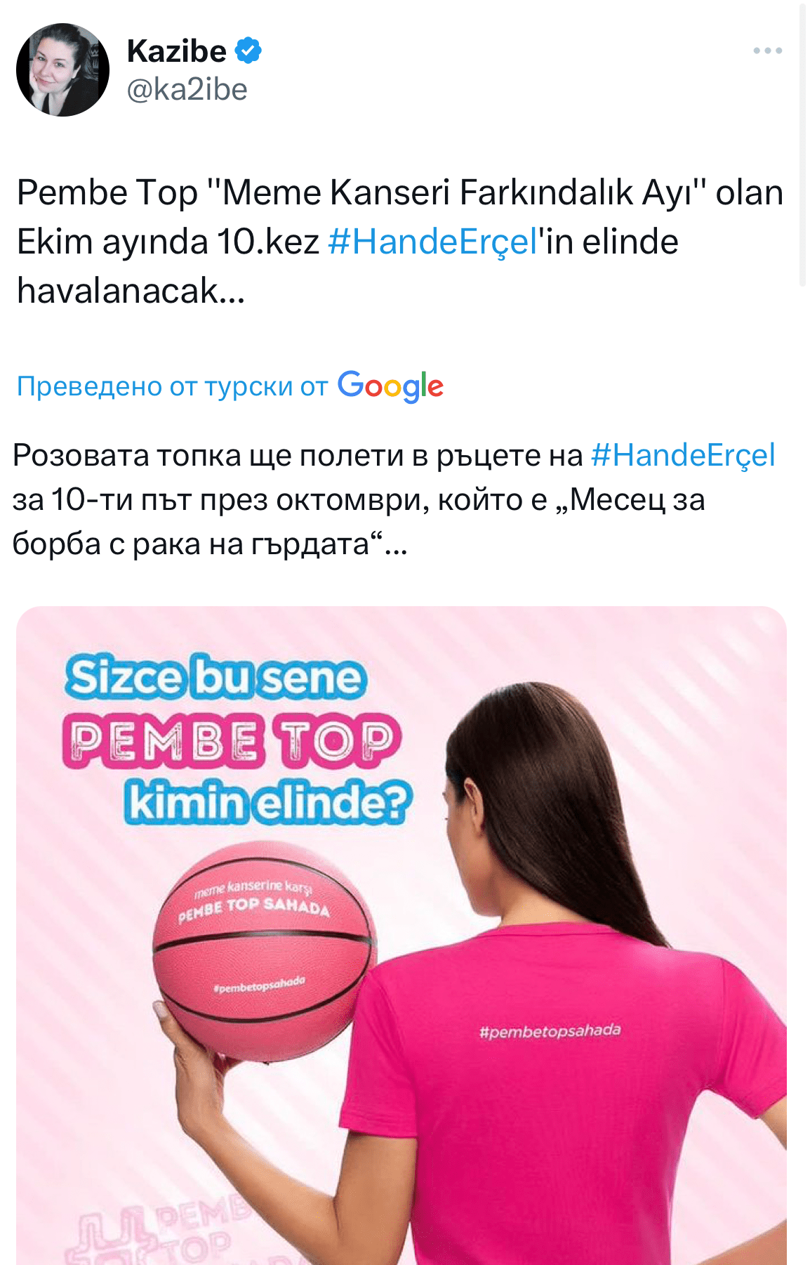"Розовата топка отново ще излезе на терена в мача Анадолу Ефес СК – Реал Мадрид на 12 октомври 2023 г., за да ви напомни още веднъж за животоспасяващото послание за ранна диагностика. Известната актриса и модел Джансу Дере ще скача с Розовата топка."
