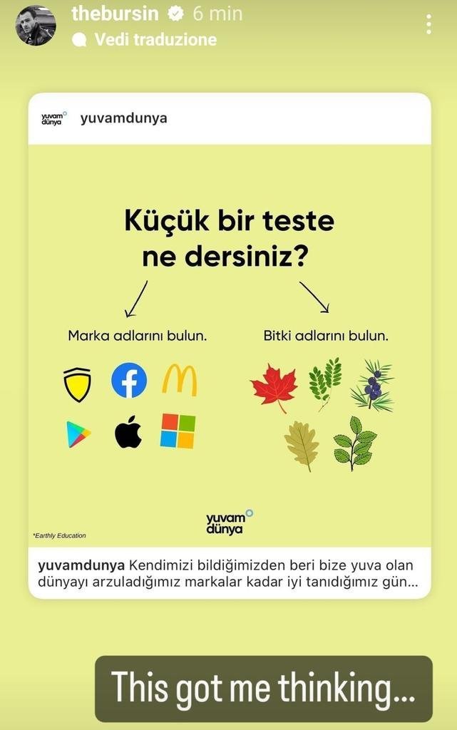 "Instagram история на Керем Бюрсин, 20.09.2023 г. - репост на публикацията на сдружение Ювам Дуня с коментар „Това ме накара да се замисля...“