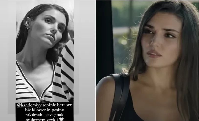 Известният режисьор Yeşilyurt сподели снимката на Hande Erçel в профила си в Instagram и написа : „Страхотно е забавно да следвам история и да се бия с теб.“