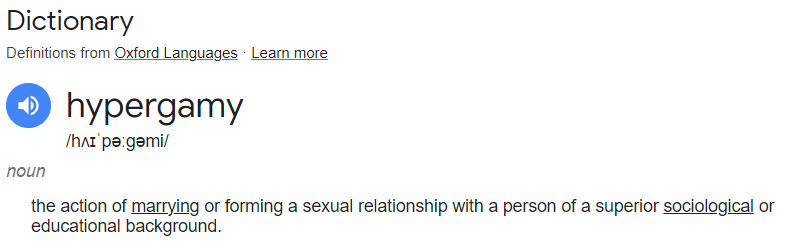Във всички дефиниции на hypergamy, които съм срещал, общото е, че винаги присъства думата superior. "Equal" e тука има-тука няма в различните дефиниции, така че не може да се взима под внимание. Казано на по-прост език и метафорично (преди някой от буквоядите да се е обадил), "търсене на по-добрата сделка".