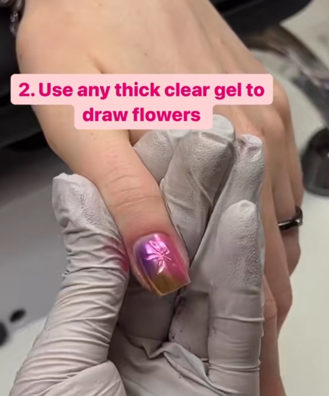 Доколкото разбрах от видеото, втриват различни пигменти по целия нокът върху изпечен топ лака, рисуват цветенцата с безцветен гел, пекат и минават с памук, за да изтрият излишния пигмент.