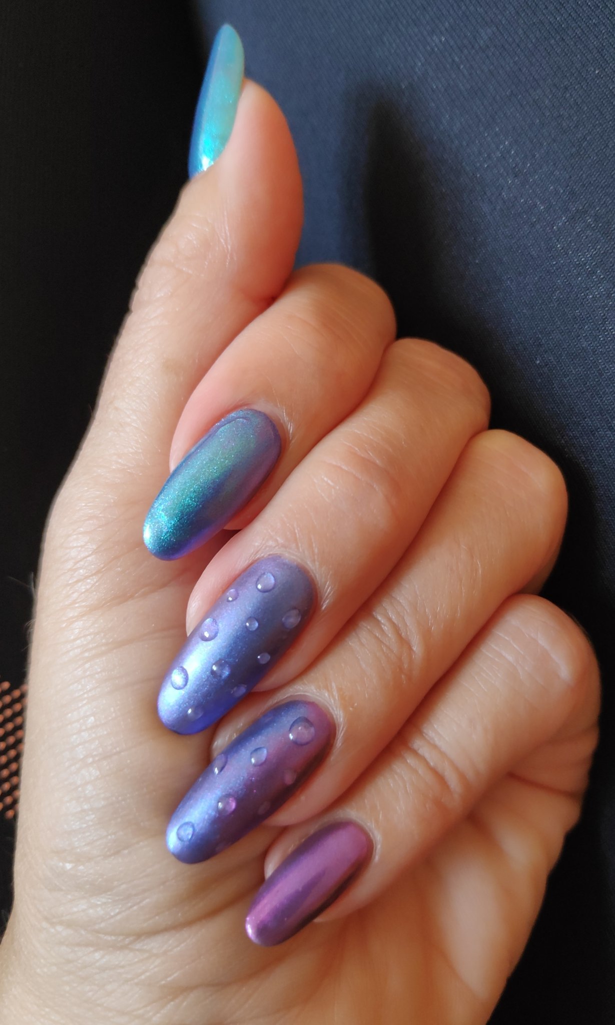 Аз съм правила много отдавна подобен с пигмент и релеф, но без да трия. Качвам само да ке види как е с матов топ. А капките са с по-гъст топ лак. Обаче аз пигментите съм ги слагала винаги върху черна основа. На това бледо розово не знам дали ще се виждат толкова добре цветовете.