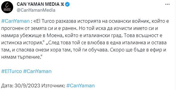 Хайде в очакване сме на ЕлТурко.Дано започне в края на месеца по случай 100 год. от създаването на Турската репубика-29.10.1923г.!Дали Дисни+ ще пуснат сериала с Арас Булут Ийнемли за М.Кемал Ататюрк?