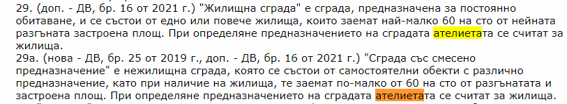 Т.е. Ателието си е с необходимите по изисквания за Жилище помещения, височини и т.н.