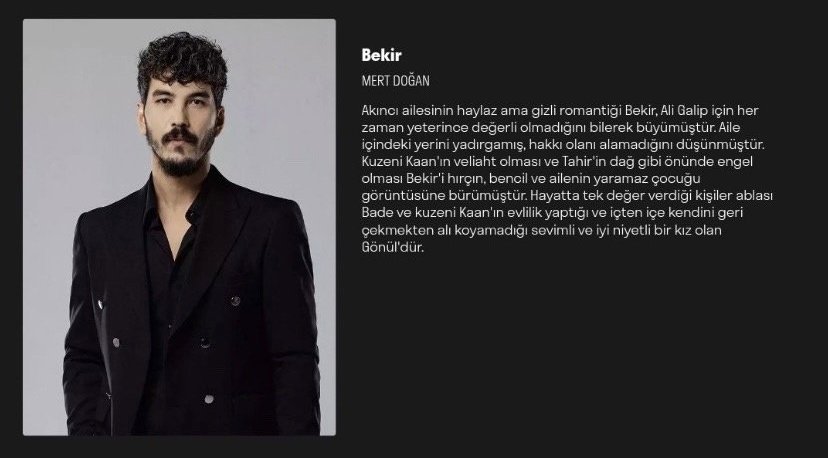 Бекир, палав, но таен романтик от семейство Акънджъ, израства със съзнанието, че не винаги е бил достатъчно ценен за Али Галип. Чувства се странно в семейството и смята, че не получава това, което заслужава. Фактът, че братовчед му Каан е престолонаследник, а Тахир е като планина пред него, прави Бекир да изглежда като избухливо, егоистично и непокорно дете в семейството. Единствените хора, на които държи в живота, са Гьонюл - сладко и добронамерено момиче, за което братовчед му се жени, и по-голямата му сестра Баде, от които не може да се дистанцира.