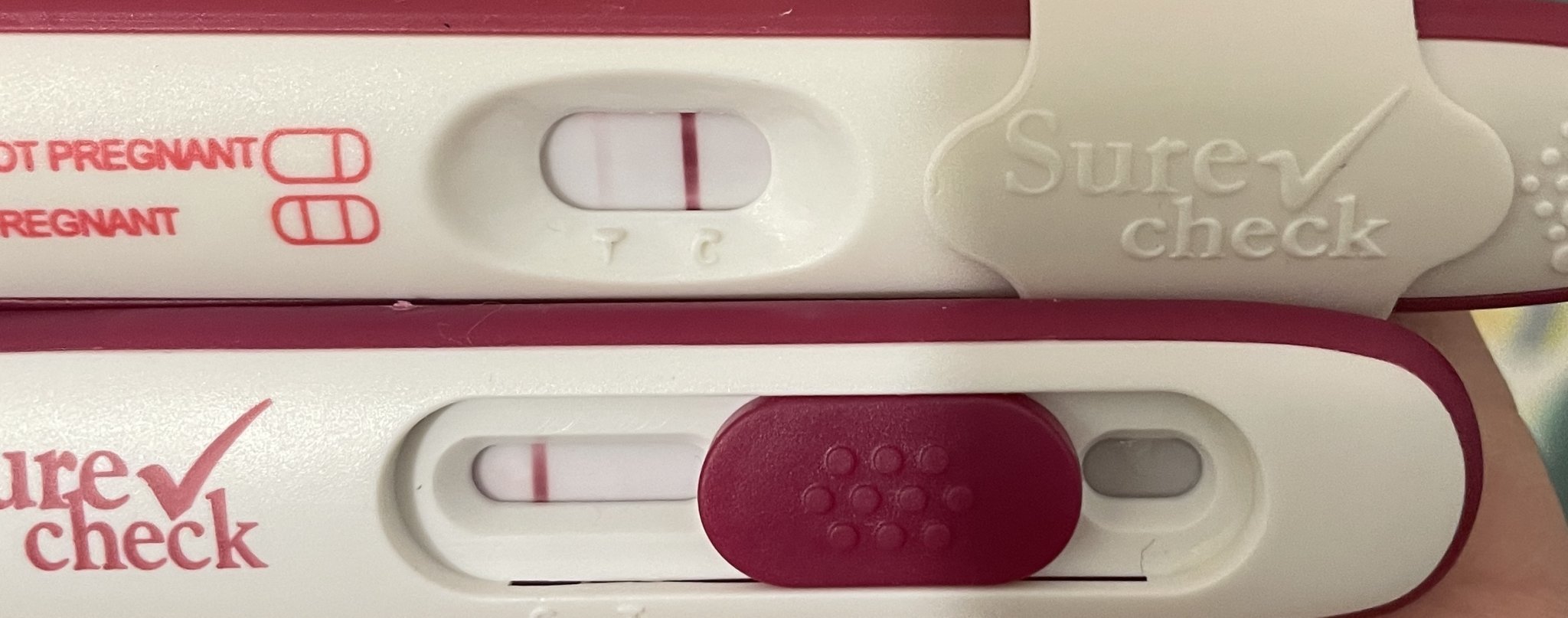 Правени са с две марки тестове… Два на believe и три на sure check, като последния е с пипета а другите писалки. Вчерра ми даде положителен и на дветв марки, днес имам 2 почти отрицателни и на двете марки и един положителен леко по-ярък от вчера. Единственото, което забелязвам, е че сутришния днес е по-блед от вчерашните и от днескашния вечерен