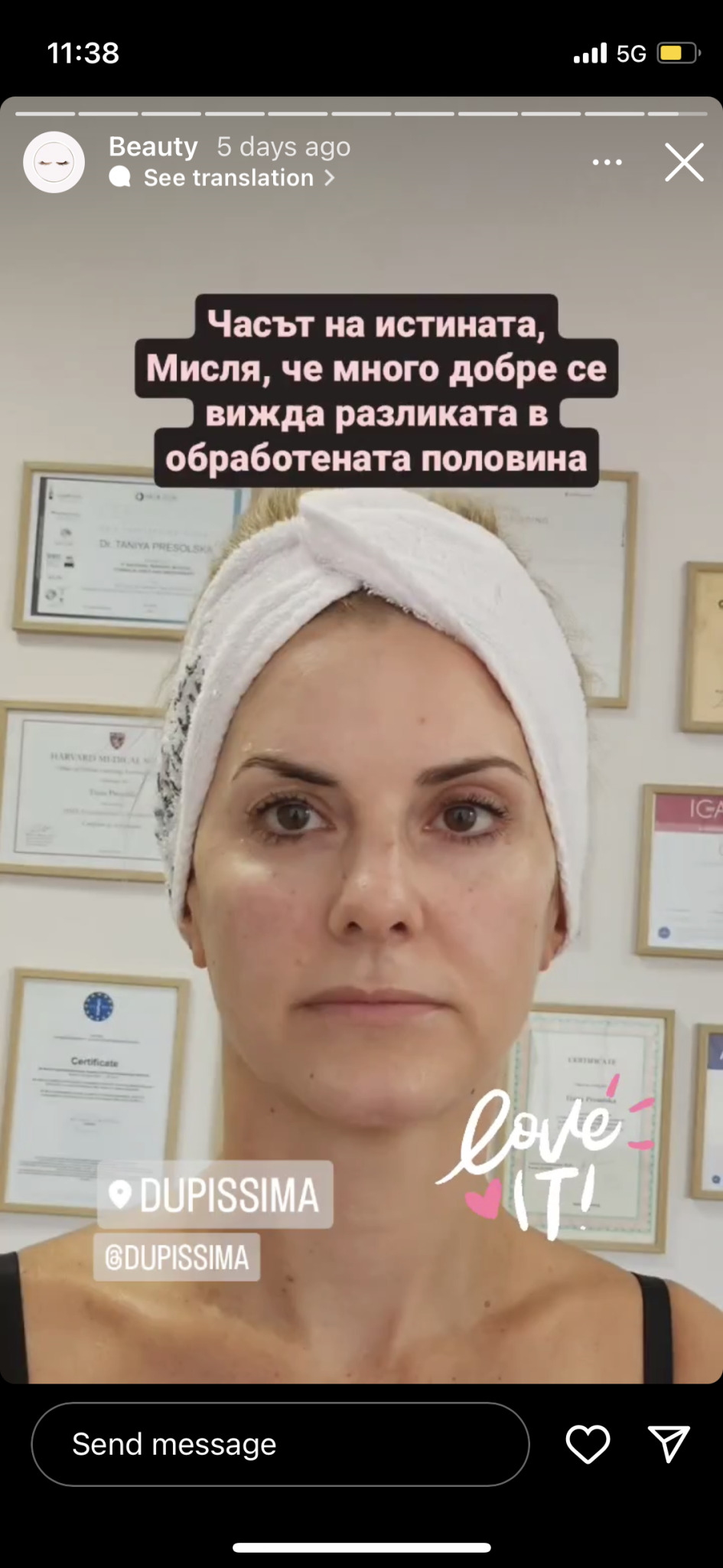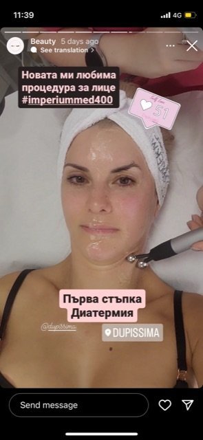 Преди няколко дни ми излезе на стори на Тиана( собственичката на Дуписима) нова процедура за лица. Доколкото виждам действа като фейслифт по снимките долу. Само лявата ѝ половина е третирана