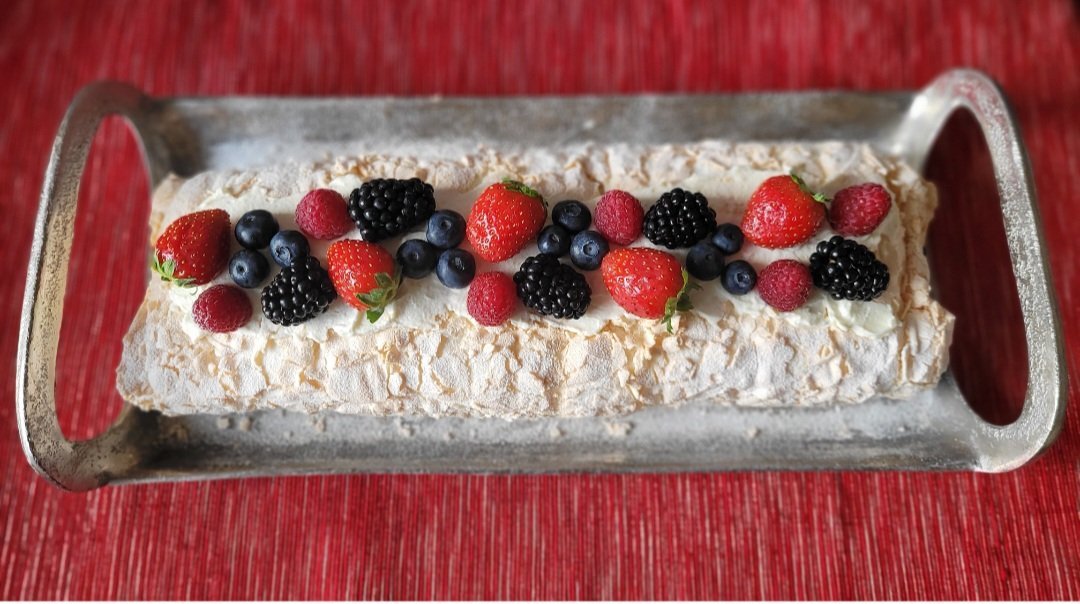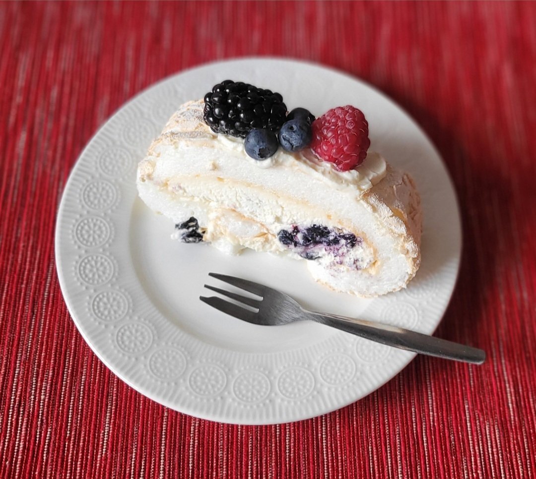 За моите две именички в нас направих разновидност на торта Павлова. Отдавна ми беше мерак за това руло с малини. Невероятно вкусно стана и може да се направи от предния ден и да престои една вечер в хладилник.