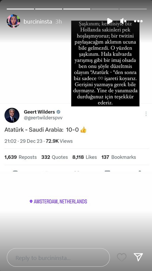 Предполагам, че Бурчин и съпругът ѝ са наясно кой е Герт Вилдерс /лидер на антиислямистката и антимигрантска партия в Нидерландия, която наскоро спечели изборите/, но публикуваха негов туит "Ататюрк - Саудитска Арабия: 10:0 Hands Plus1" Sunglasses