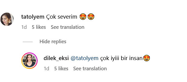 Текстът към снимката с Халит "Беше много специално да бъда в този проект, зарежда се изключителен сериал". В един от коментарите блогърката Тууба Болат е написала - "Çok severim😍😍 - много го харесвам", а Дилек е отговорила - "çok iyiii bir insan😍 Той е много добър човек😍"