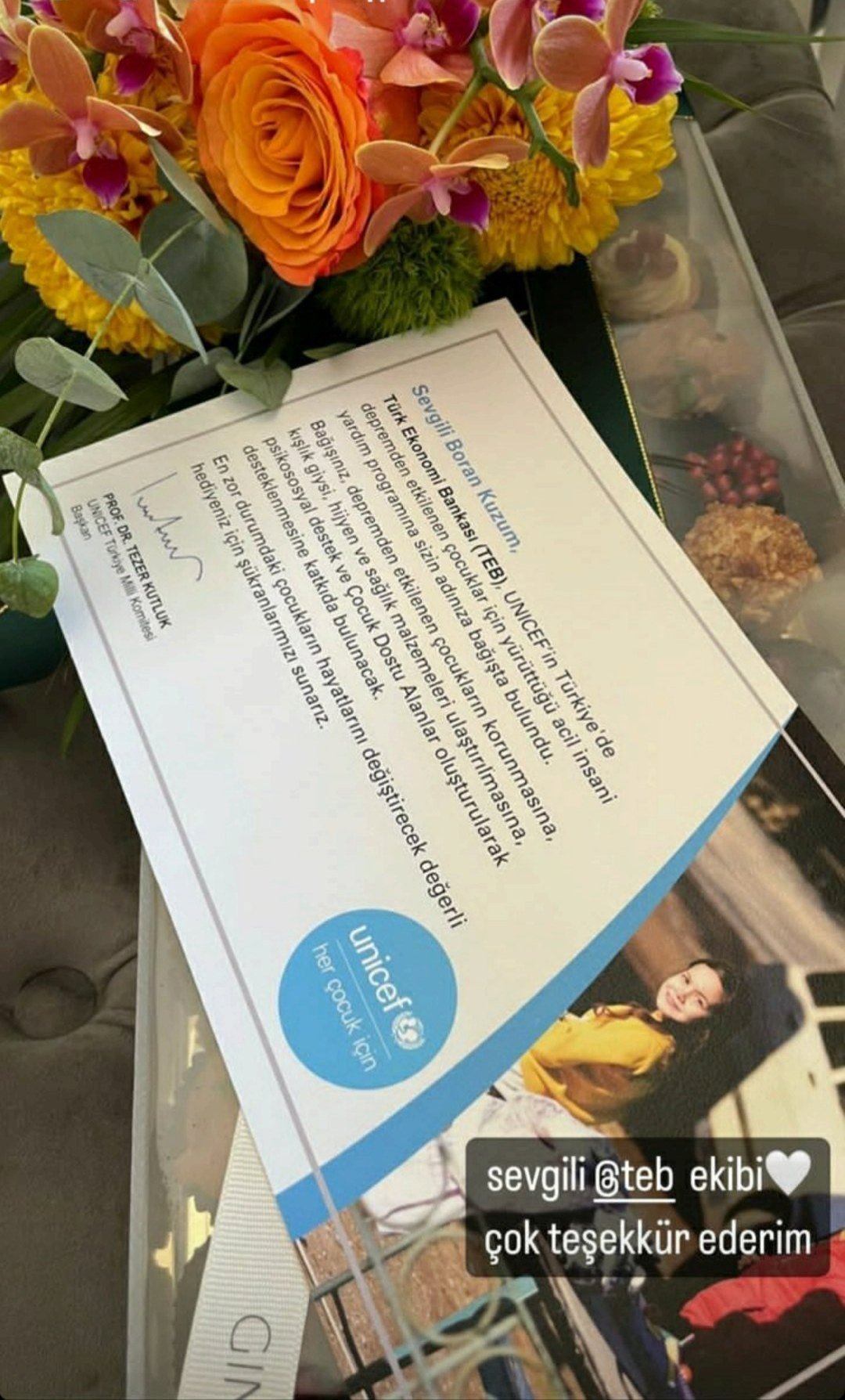 Турската икономическа банка (TEB) направи дарение от ваше име на програмата на УНИЦЕФ за спешна хуманитарна помощ за деца, засегнати от земетресението в Турция. Вашето дарение ще помогне за защитата на децата, засегнати от земетресението, ще осигури зимно облекло, хигиенни и хигиенни продукти и подкрепа чрез осигуряване на психосоциална подкрепа и места, подходящи за деца. Изказваме своята благодарност за вашия ценен подарък, който ще промени живота на децата, намиращи се  в най-трудна ситуация."„