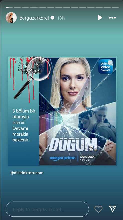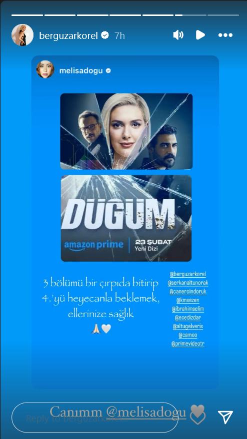 "Ние сме в история, в която се опитваме да разплетем възлите с Бергюзар Корел, Джанер Джиндорук и Серкан Алтунорак, водещите актьори от първия сериал на Prime Video в Турция, "Възел". Докато светлините на разпита търсят истинския престъпник, всеки гледа всички други, всечки се обвиняват един друг, дори себе си... Животът не е ли малко като "Възел"? В точката, която не можете да развържете, възелът се завързва автоматично."