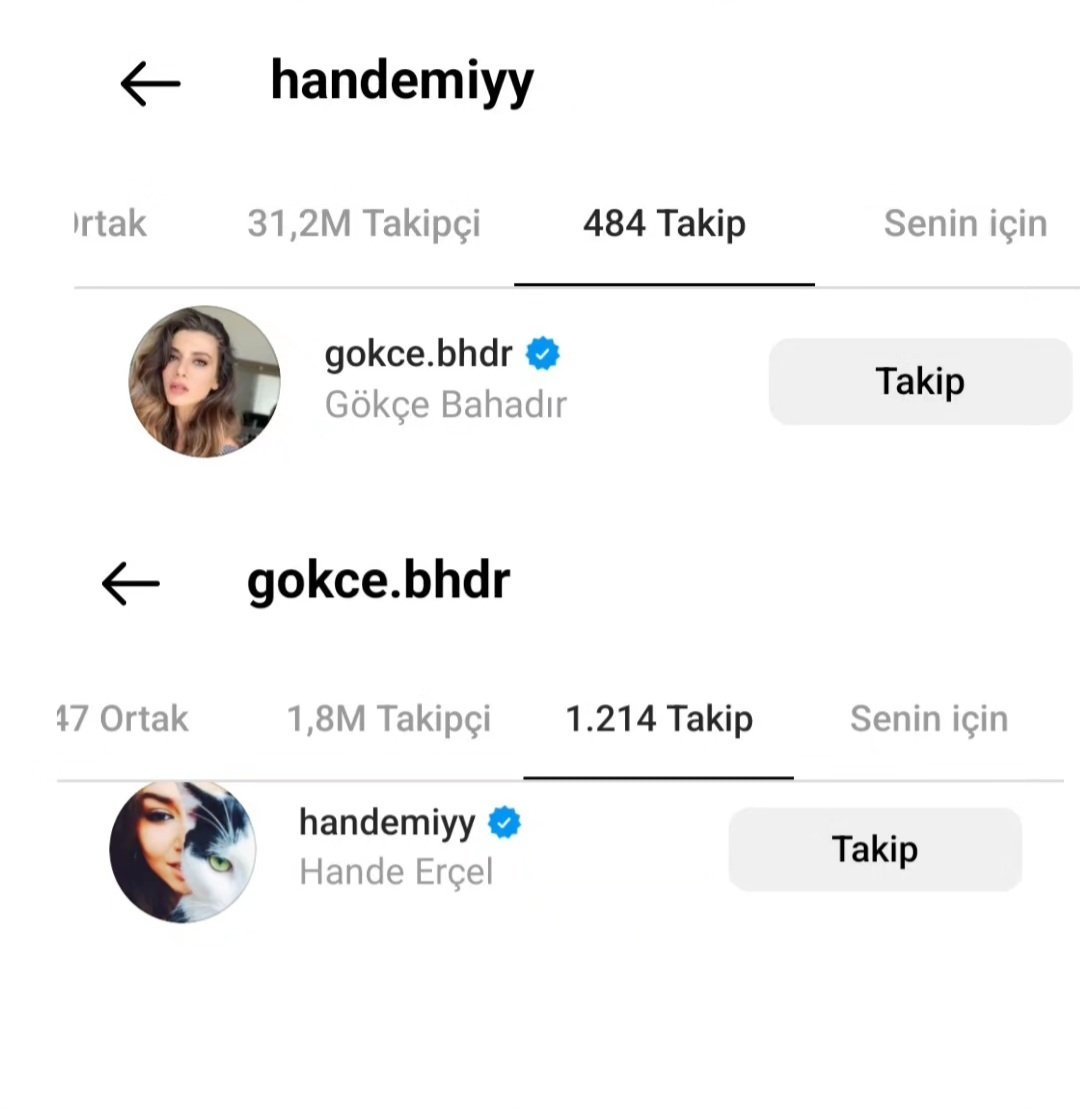 Ханде Ерчел и актрисата Гьокче Бахадир се последваха взаимно в Instagram