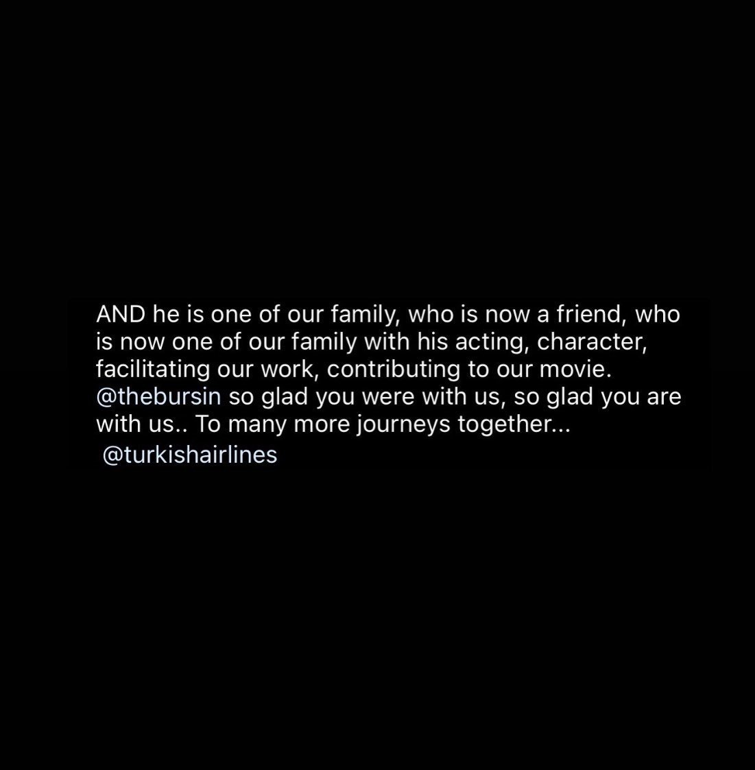 "И той е един от нашето семейство, който сега е приятел, който сега е един от нашето семейство със своята игра, характер, улеснява работата ни, допринася за нашия филм. @thebursin толкова се радвам, че беше с нас, толкова се радвам, че си с нас.. За още много пътувания заедно... @turkishairlines"