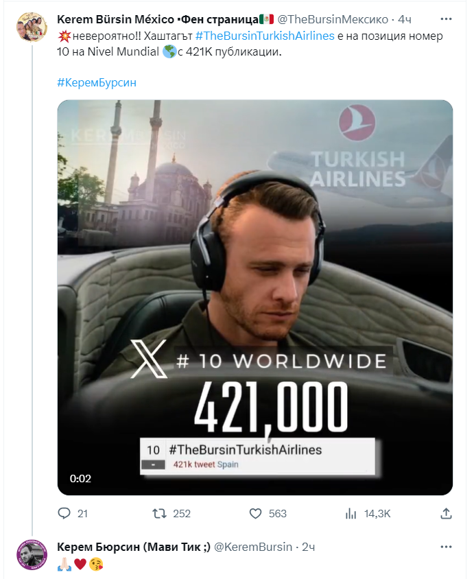 "Данни за тенденциите за стартирането на рекламната кампания на Turkish Airlines като посланик на марката KeremBürsin, в четвъртък, 05 октомври, достигайки 439K публикации и 8-ма актуална тема в световен мащаб."