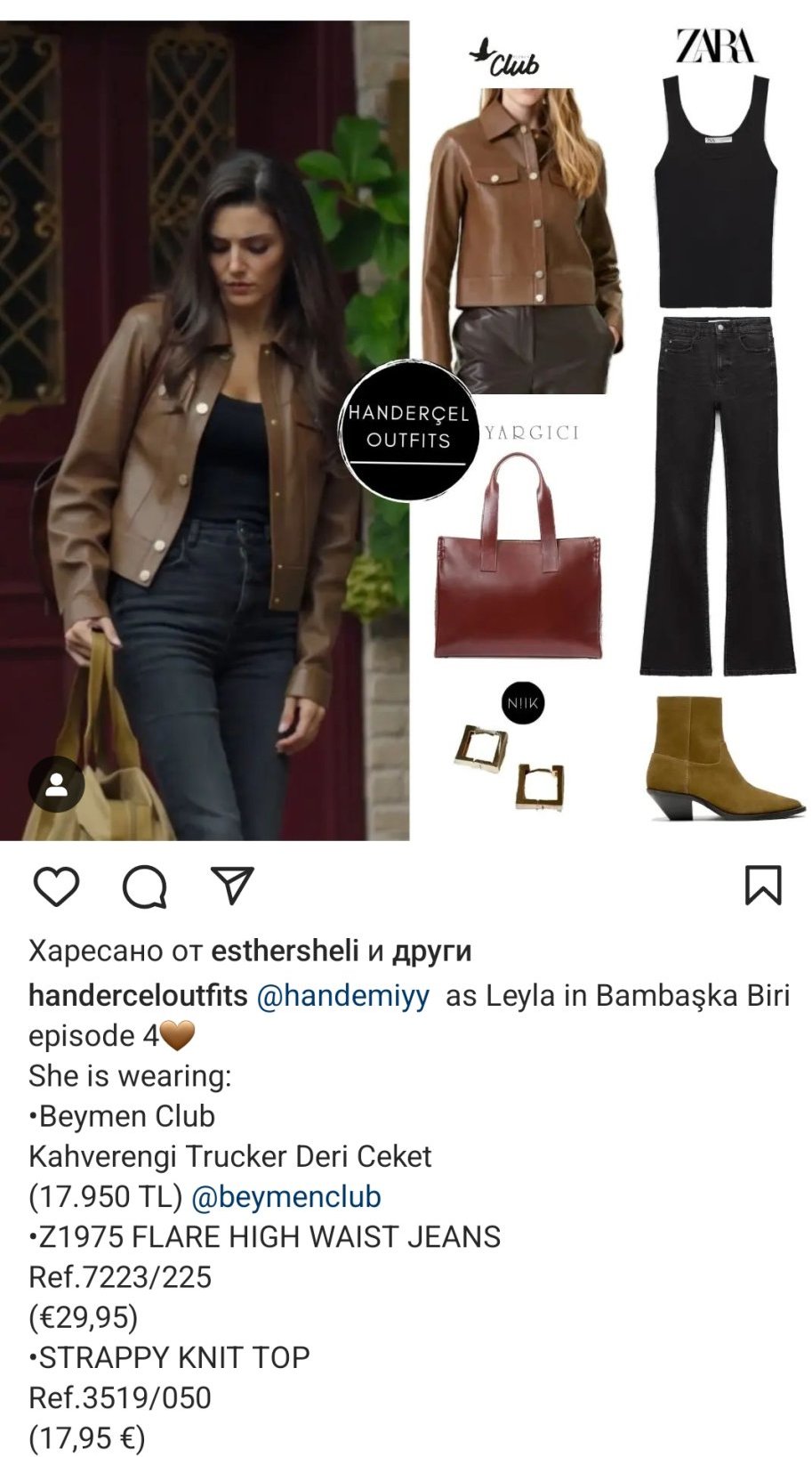 Преди ми излизаше информация за дрехите, с които е била облечена Лейла в даден епизод. Повечето бяха Зара. В края на този епизод беше с едно кафяво кожено яке. Много ми хареса, но не мога да окрия, каква марка е.