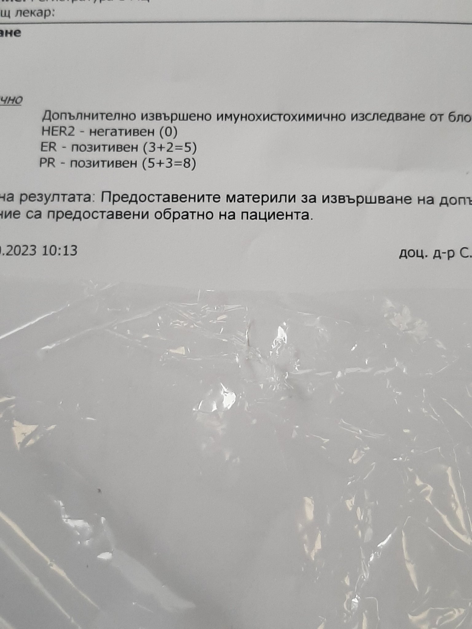 Д-р Факирова ми прави хистологията след корбиопсията. Почти същата е, като хистологията след операцията (има спадане с по 1-2 стойности на естроген, прогестерон и Ki67).