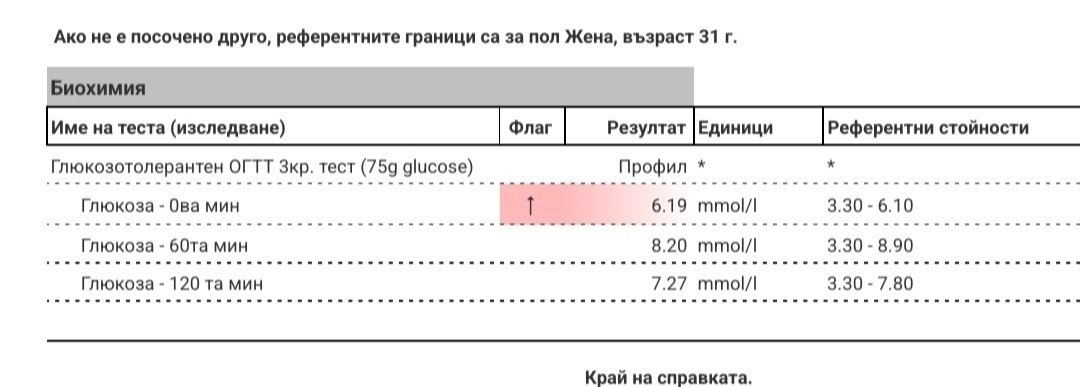 Това, което ми каза моята ендокриноложка относно референтните стойности по време на бременност е 3,5-5,5 на гладно, до 7,8 на първи час и под 6,7 на втори час.