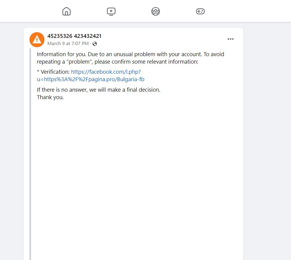 идвам с въпрос, случайно дали някой е получавал това съобщение: Аз го получавам на вторият си профил/бизнес страница, с което ме заплашват, че един вид са засякли нередовна/неправилна активност там и ако не кликна на този линк ще ми деактивират/затворят профила. Обаче това го получавам вече повече от седмица през няколко дни, нищо не правя, профила ми все още си стои. Но ме дразни, че все още ет време на време получавам тези заплахи. Какво е това? Някой получавал ли ги е? Мисля, че е някакъв неадекватен спам...