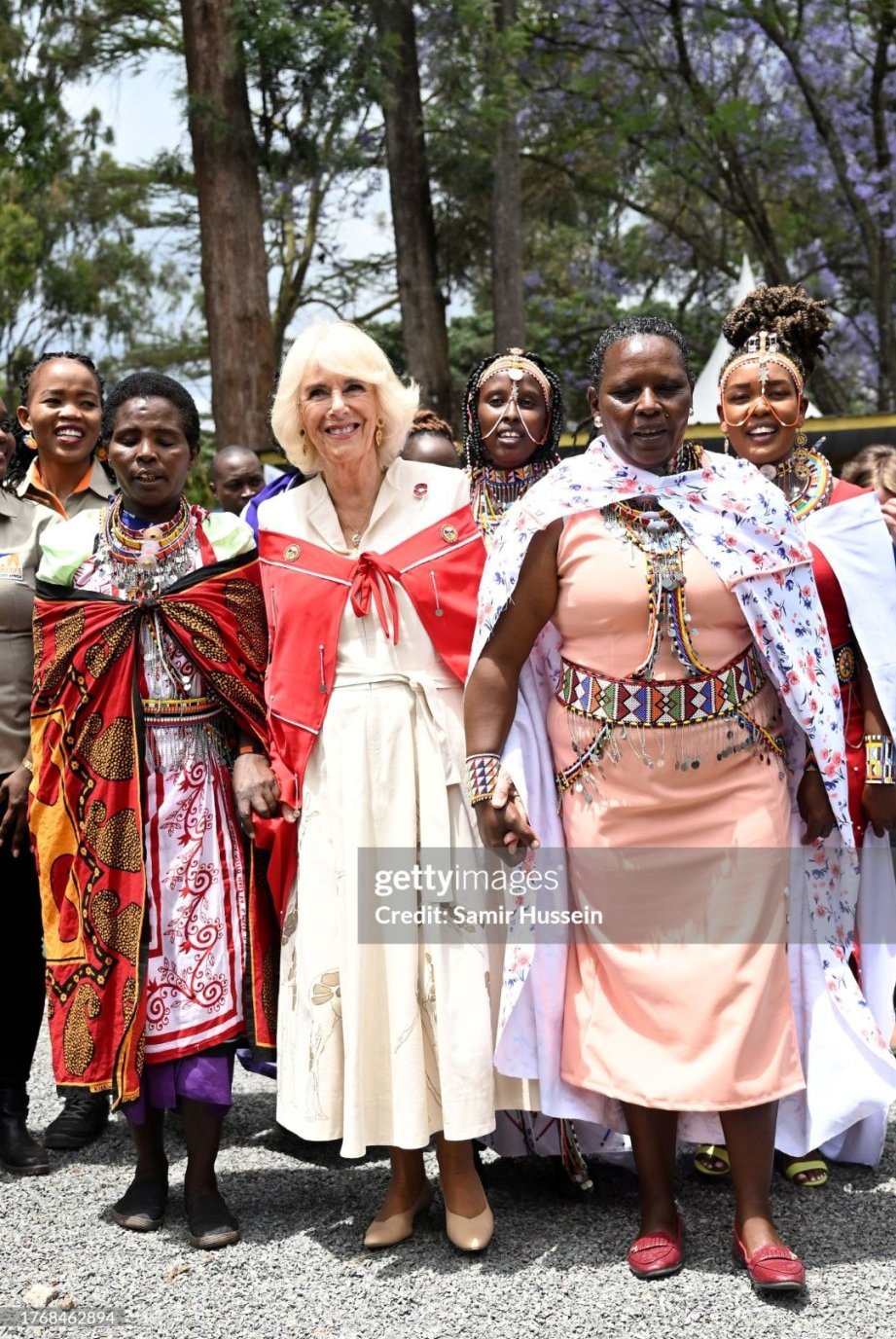 Кралица Камила получи шука от членове на общността по време на посещението си в Кенийското общество за защита и грижа за животните (KSPCA) в Найроби, Кения днес