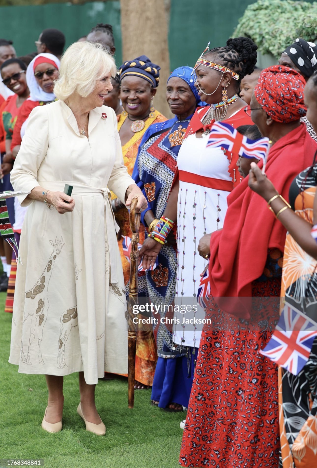 Кралица Камила се среща с кенийски дами по време на ангажимент на гробището Кариокор в Найроби тази сутрин.