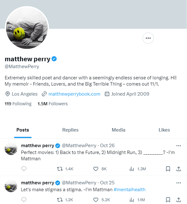 Нали има една песен как "клоунът винаги е тъжен", явно да разсмиваш хората носи бая тъга в живота. Иначе последното, което съм чела за Матю Пери беше за книгата му, в която пита защо готин човек като Ривър Финикс е умрял, а Киану Рийвс още ходи по земята... и след разпространението в търговската мрежа се наложило да се извинява за това изречение.