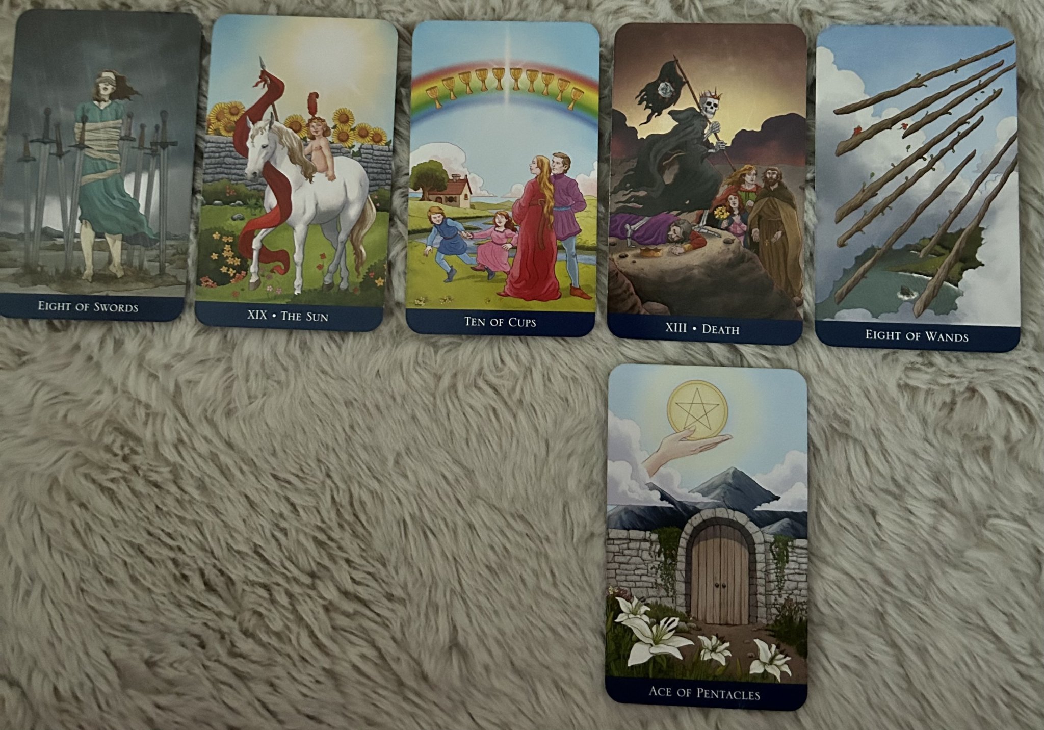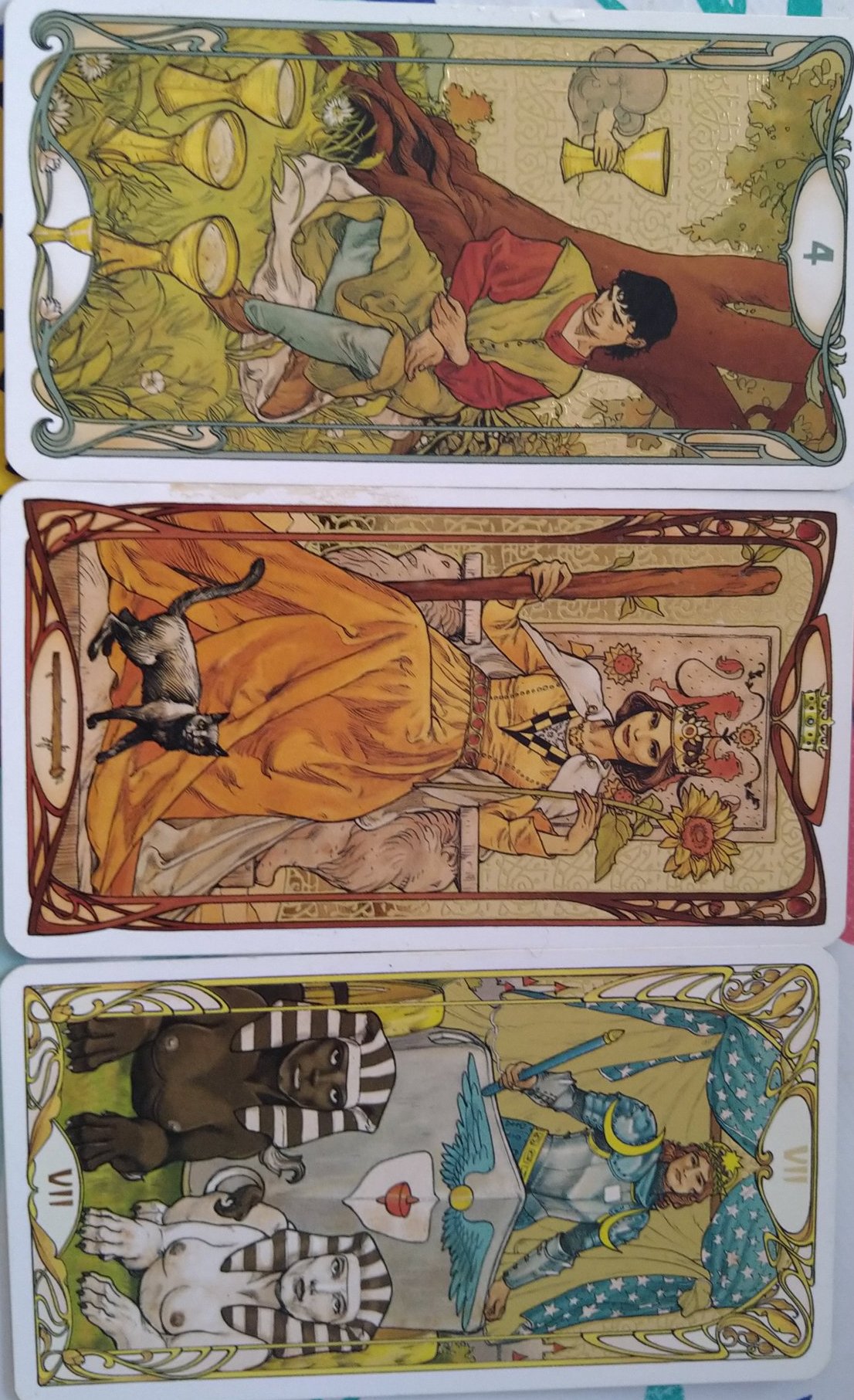 Първите две карти са подсилващи се една друга и говорят за тъга, загуба, процес на възстановяване. В случая питащата минава през труден период чувства се самотна и изоставена по петица чаши и минава през процеса на възстановяване по шестица мечове.