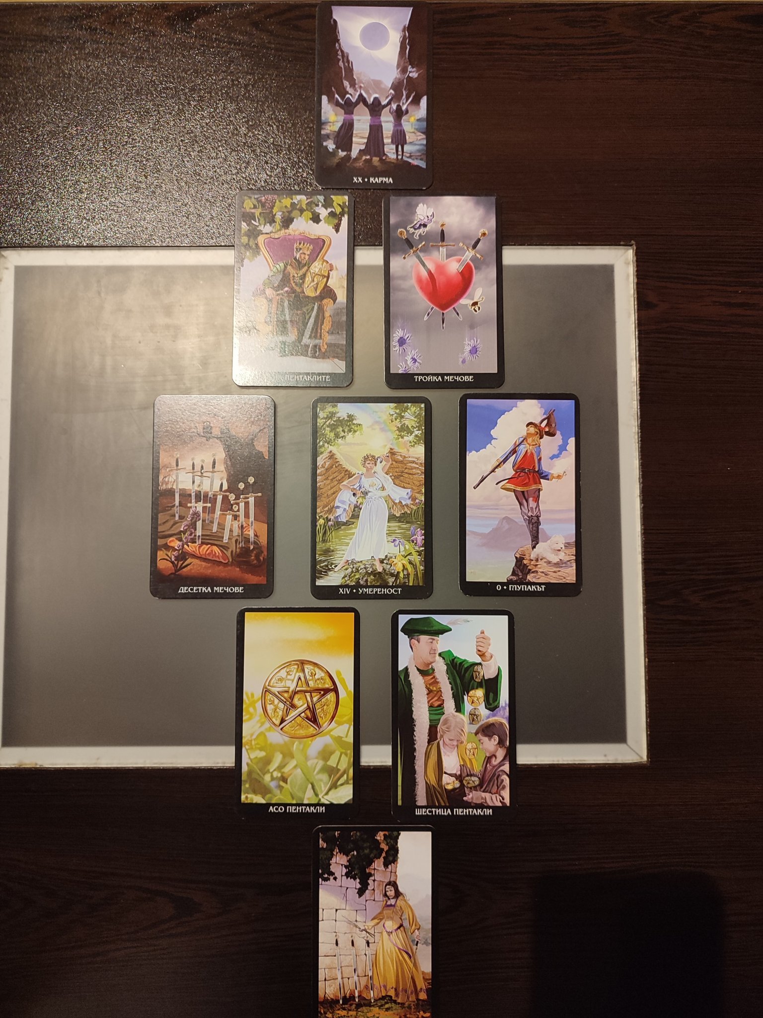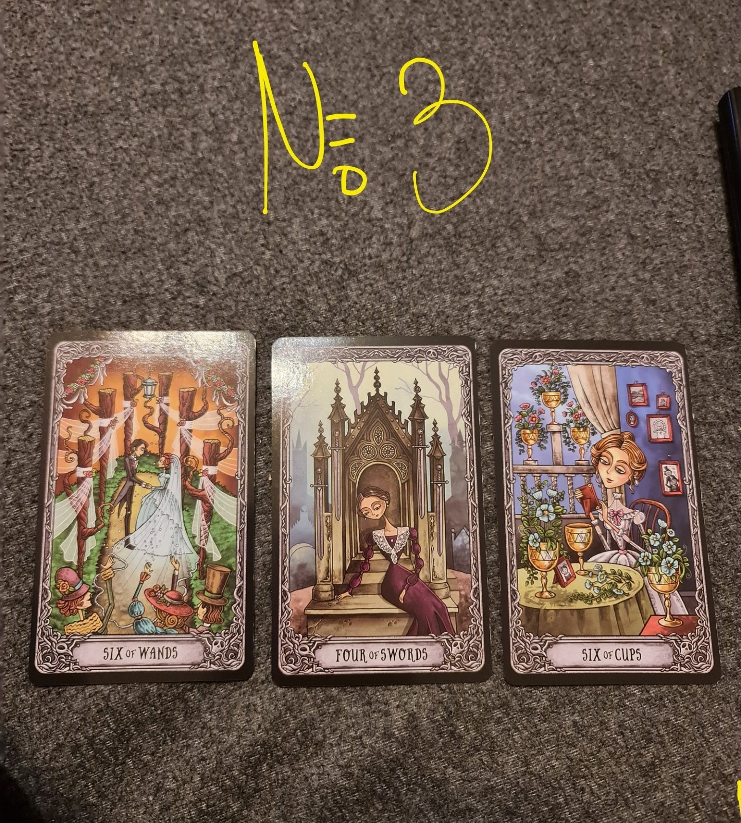 При номер 3 тази 4 мечове ме подведе много. Не знам как така с нейното присъствие победи този играч. И в последно време все повече се убеждавам,че която първа карта се появи в подредбата най силно натежава за отговор на даден въпрос. А не последната ... А и това дето правите вие като сбор на всички карти явно накланя везната към правилния отговор, има истина така..