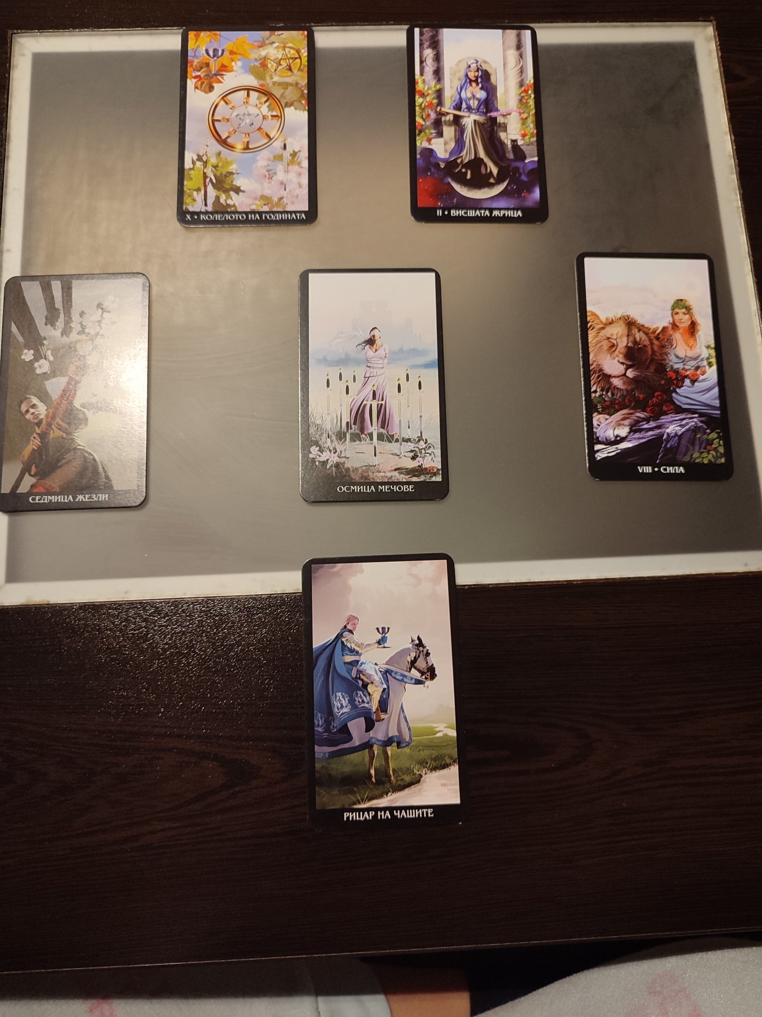 За втория въпрос - ключът е в нея, и аз мисля, че ако поработи със себе си резултат ще бъде Рицар Чаши, но трябва да си махне ограниченията, които сама си слага по 8 меч, да е не е толкова враждебно настроена по 7 жезли и защитаваща се и да покаже повече страст отколкото сила по Силата.