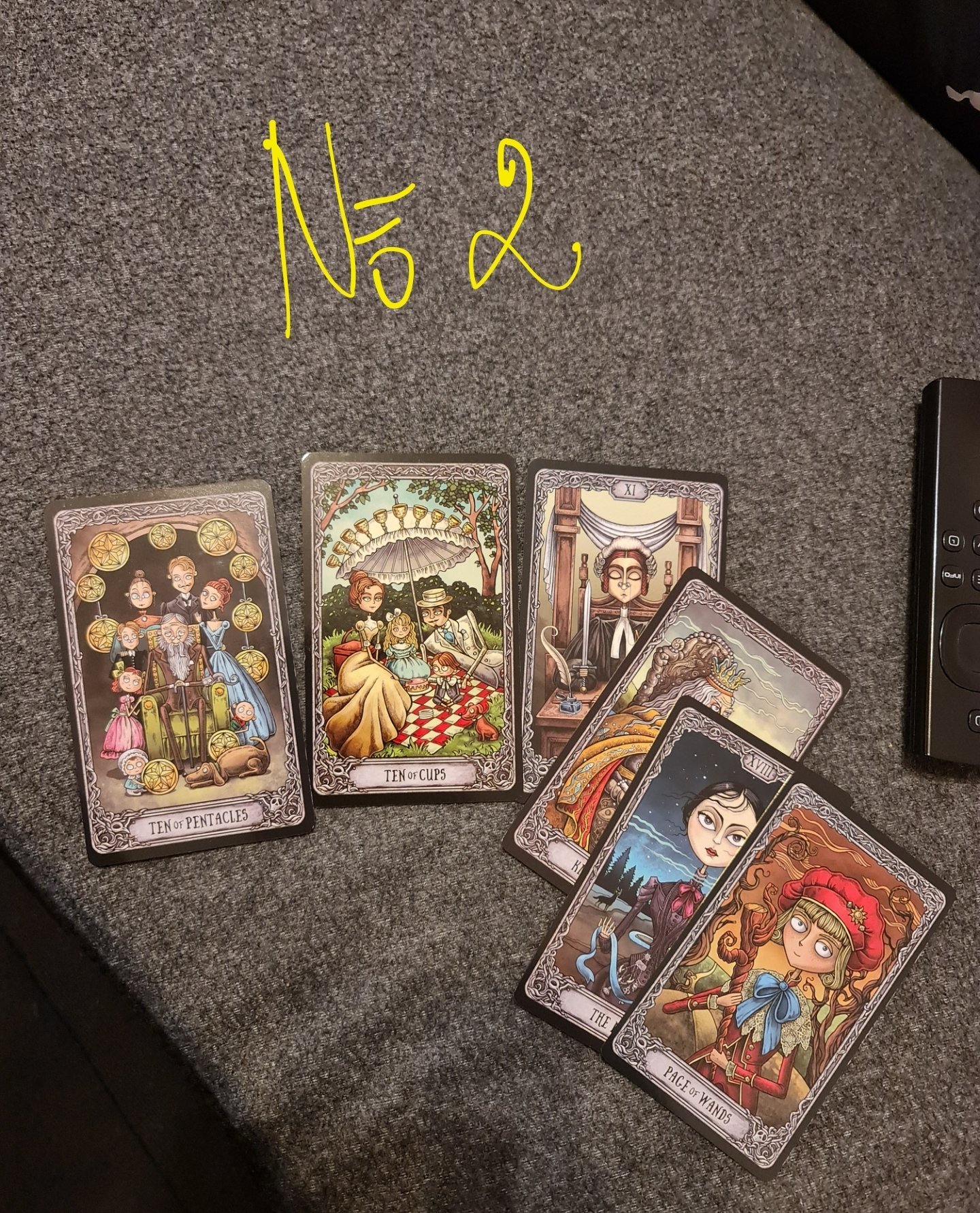 Да ви кажа, че по картите бях решила че победителя ще е номер 2 с тези две десетки, въпреки че като видях Луната уточняваща, се разклати малко убеждението ми и предположих, че и номер 1 с тези двамата жреци ще помогнат донякъде като главни аркани, но пък първа карта 7ж хич не ми хареса...