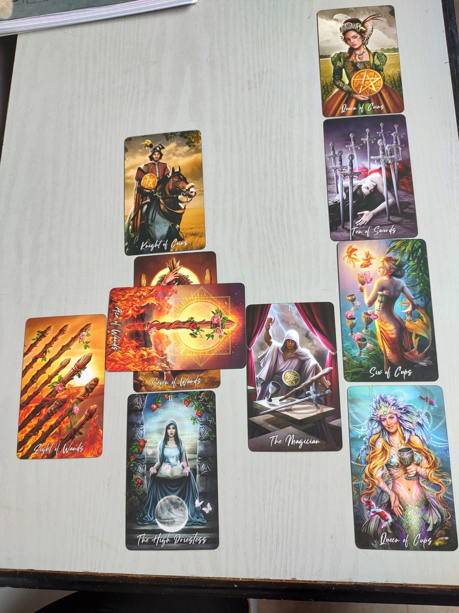 По отношение на тълкуването на картите. Аз лично винаги правя подредба. Това много ме улеснява в тълкуването, а и картите се проявяват по много интересен начин. Случи ми се шестица жезли на определена позиция да изразява, че последната връзка на дамата е завършила с това, че мъжът и си е тръгнал. Честно си признавам, че така с по три карти ми е много трудно да тълкувам, за това и рядко се включвам в темата.
