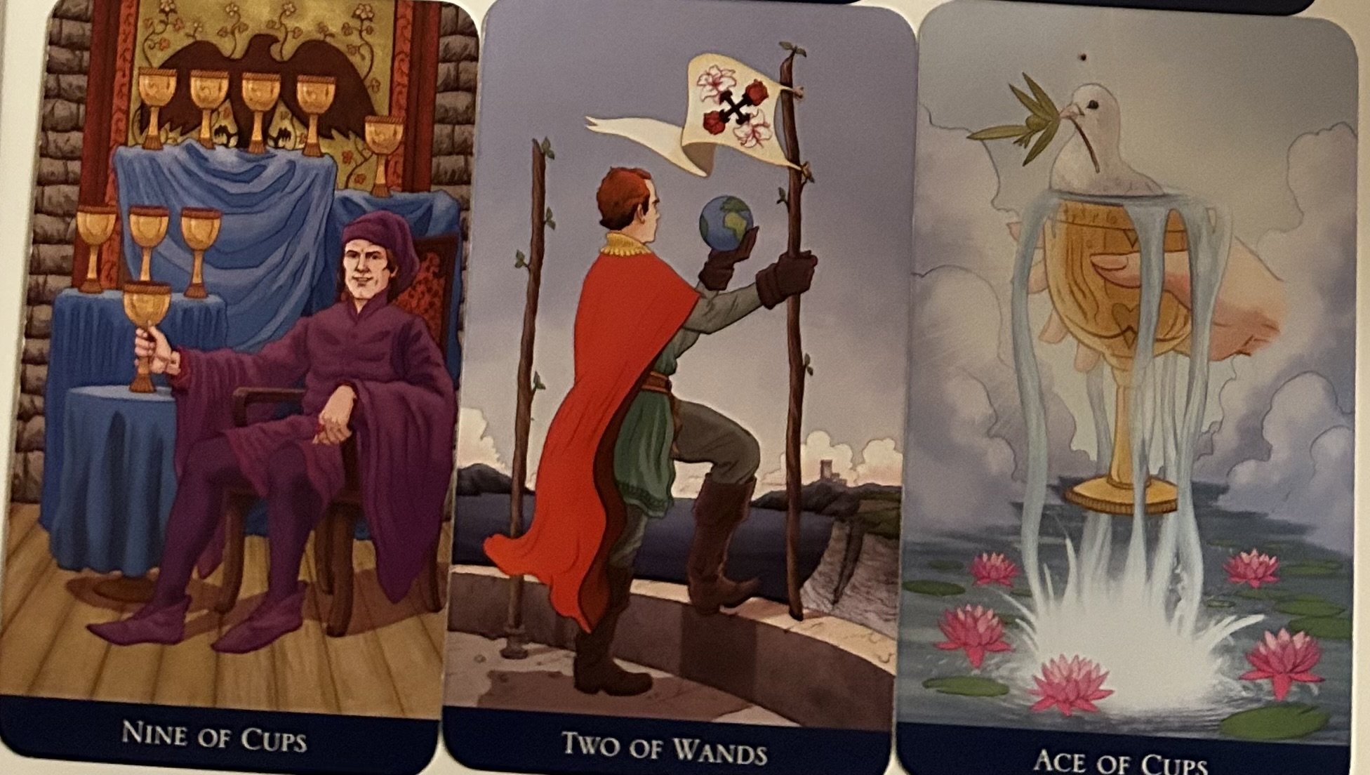 Асото чаши е емоционалният импулс. Но пък всъщност втората карта е 2ж, тук имаме колебание заради 2ката, застой някакъв, тъй че не виждам проявление на нещо, което да се случи.