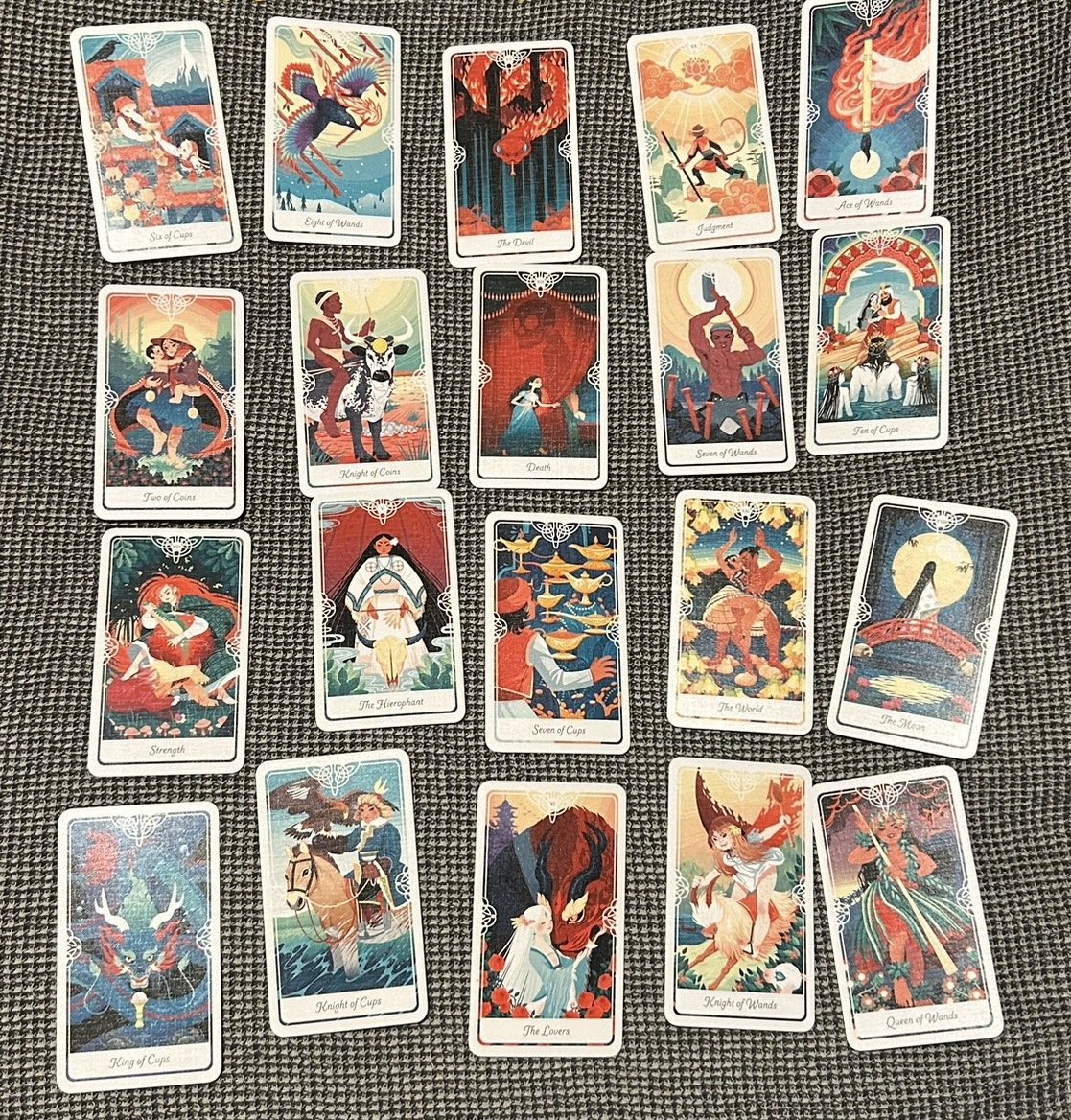 Една от най любимите ми в последно време и много говореща колода the dark mansion tarot ми е разкошна за съзерцание, но пък ми е леко кофти, една такава суховата, като пластмасова, ламинирана, на допир...няма две добри😊