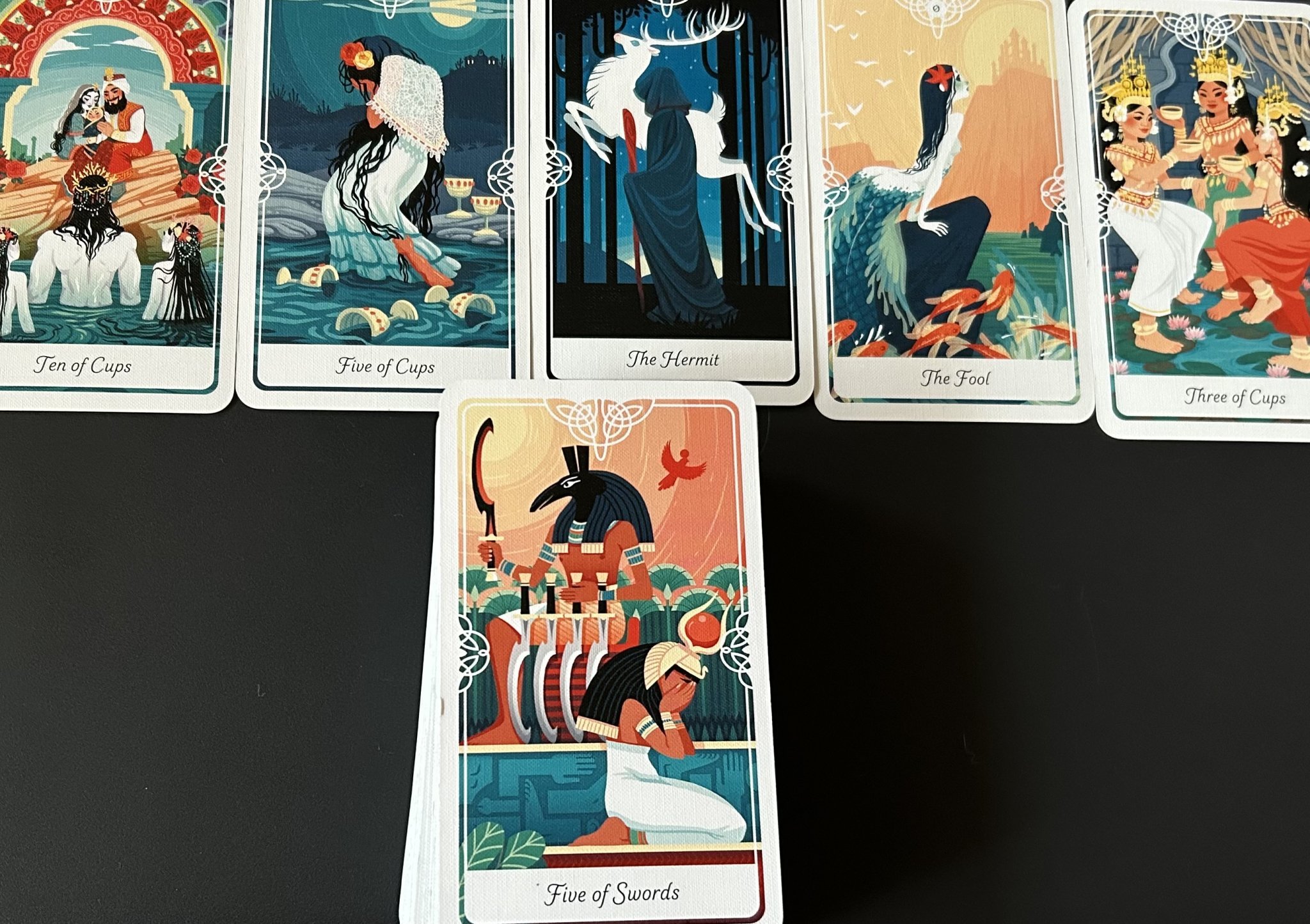 И тук за мен 10 чаши е семейството на жената, по 5 чаши някой заради това семейство се чувства зле, по 5 мечове на дъното ситуацията е много тежка -  с този Анубис картата ми говори, че тези отношения няма как да продължат по начина, по който са били. Глупака и 3 чаши е възможността да се започне от начало по същия начин - в любовен триъгълник и само за забавление, но по Отшелника някой обръща гръб на тази възможност и потегля в друга посока.