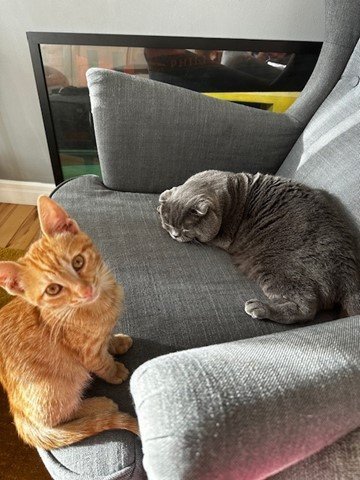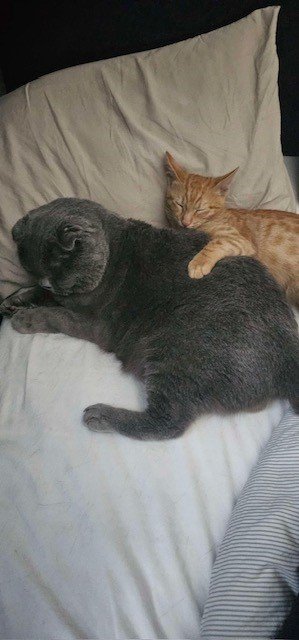 О, това са 2 минути само. Иначе е непрекъсната борба и вой. Всеки ден ме будят в 4 сутринта. Малкия иска да играе с големия, той ... и той ме дразни. Хем иска да ходи при малкия, хем съска и бяга ... но мисля, че е нормално. Събрала съм един старец с едно бебе.
