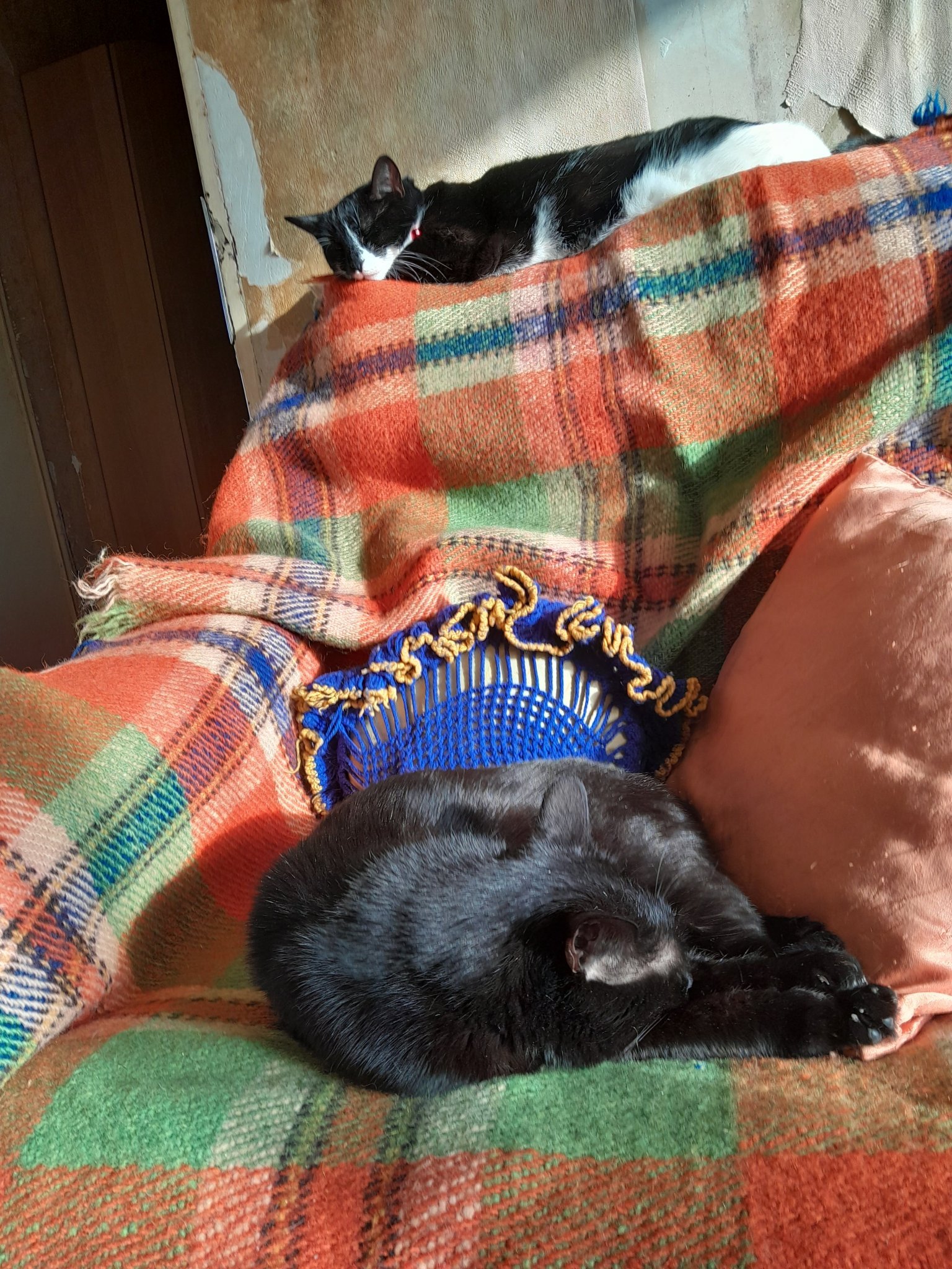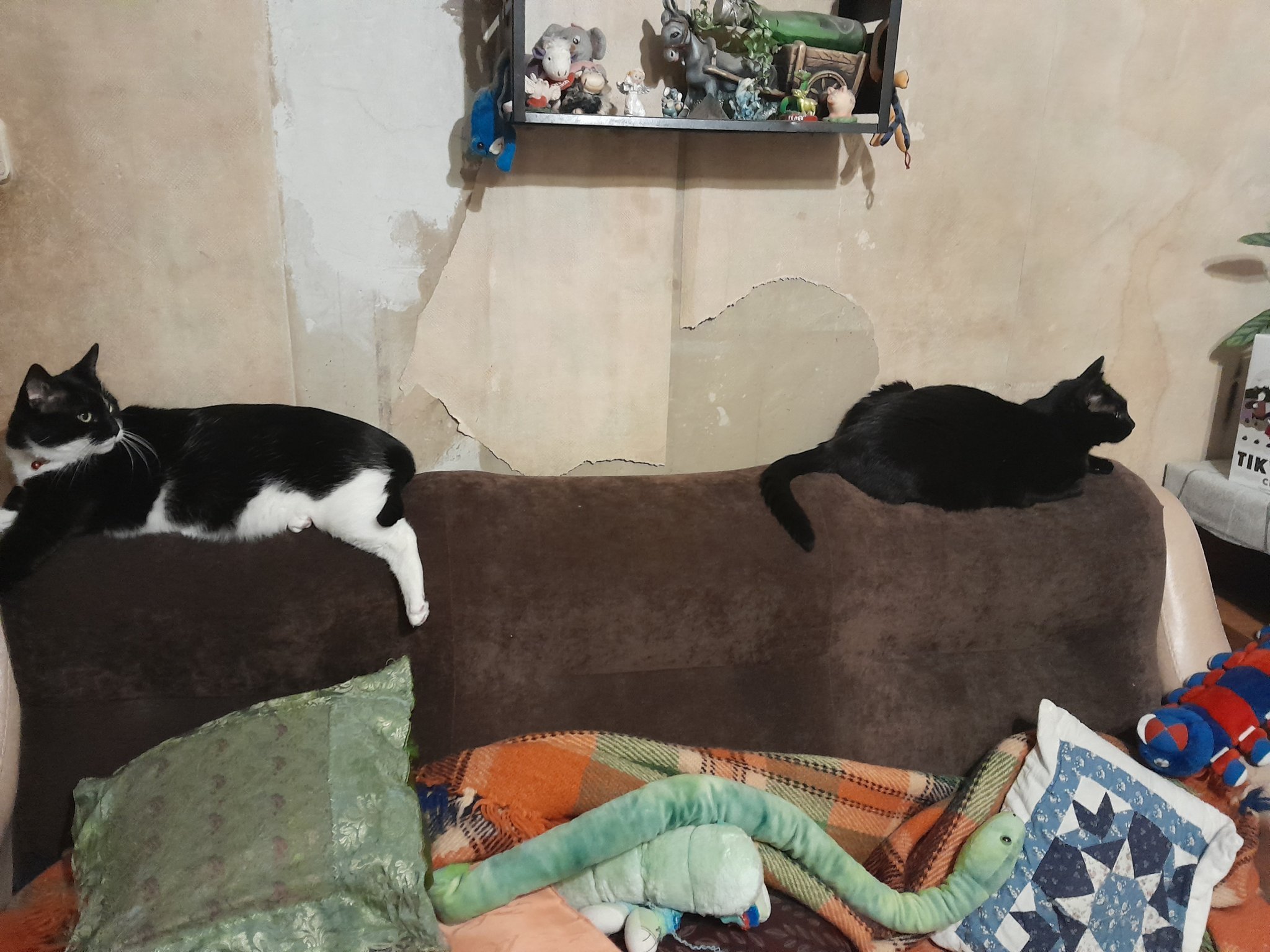 Тя си лежи на облегалката на дивана в ъгъла. Той се качва и я гледа. Тя му ръмжи. Разменят лапички, тя бяга. Кюмюра се качва на нейното място и след 5 минути се маха. Тя пак се връща.