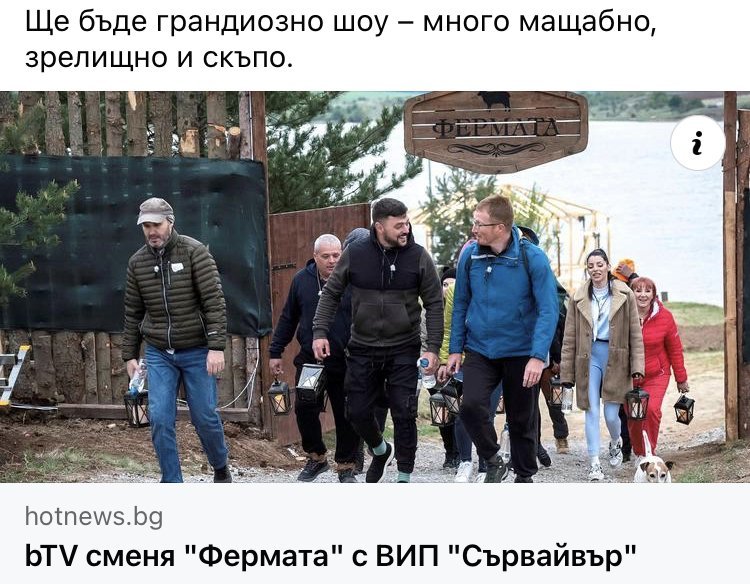Шушука се, че май става въпрос за формата „Аз съм известен, измъкни ме оттук“. Това е екстремното риалити, което преди няколко седмици българката Люси Дяковска спечели в Германия. По света същност то е вариант на „Сървайвър“ с популярни участници. Риалитито е хит в цяла Европа, но у нас не е правено досега. Ако пуснат български вариант със звезди, от bTV ще имат по-добри гаранции за успех срещу очаквания нов сезон на „Биг Брадър“, отколкото ако продължават да залагат на „Фермата“. Най-вероятно ще се търси начин да включат в проекта самата Люси Дяковска като водеща или специален участник. Аграрното риалити на Иван и Андрей окончателно спира.