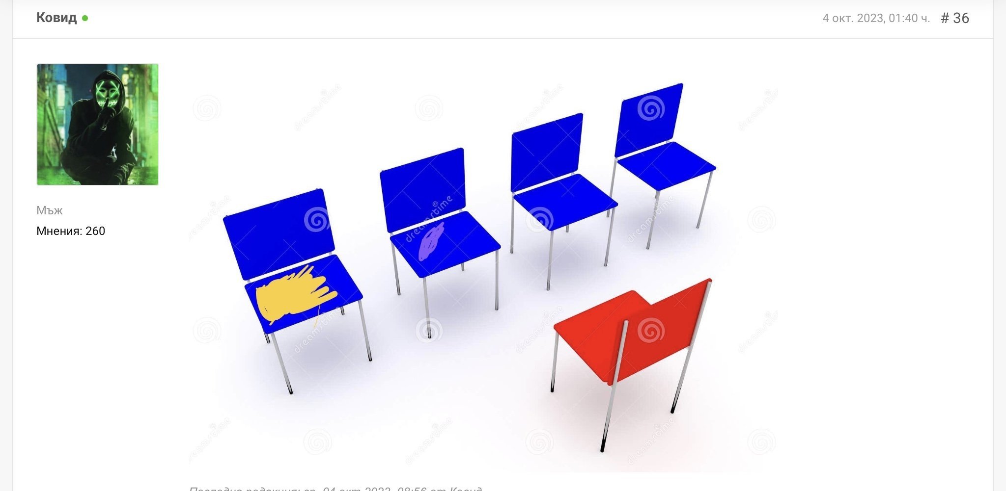 Син стол с жълто петно и вероятно второ място ( ако приемем , че броим отляво надясно ) за Момчил