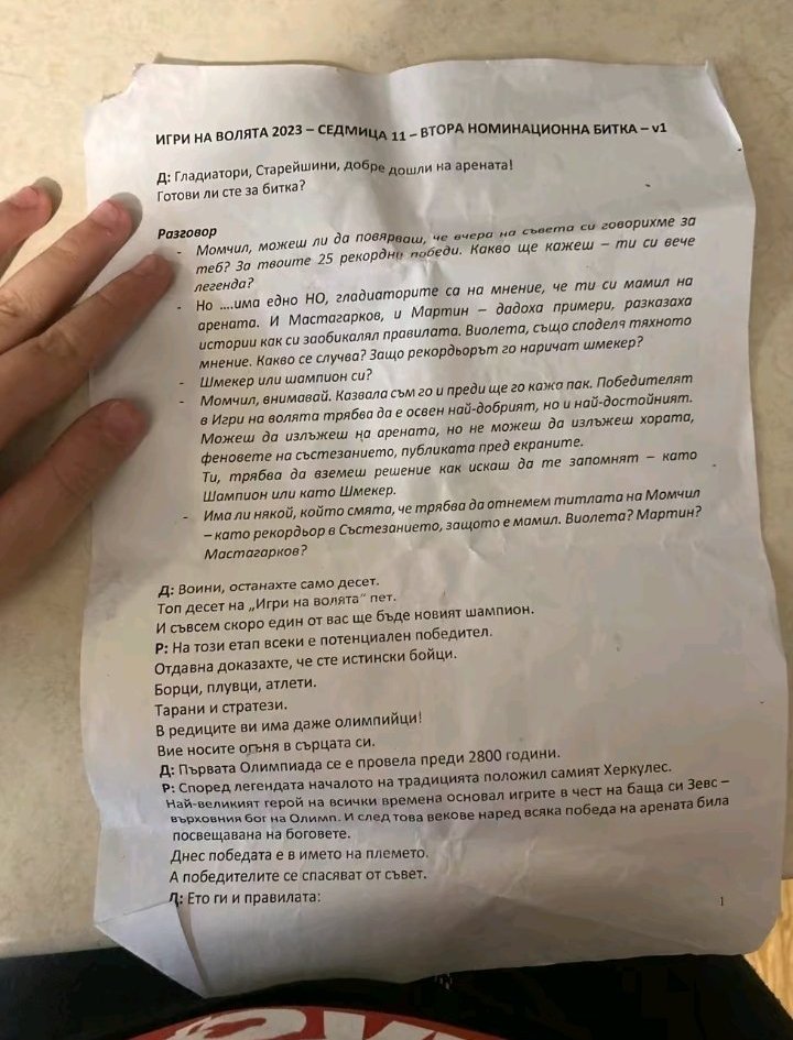 Според мен са направили компилация от мнения като последните са били от съвет на Гладиатори, а в случая споменават Мартин и Мастагарков във връзка предходните битки-тази с въртенето, когато Мартин веднага му каза, но тогава аз видях И калоян да ползва крак и другата с варелите, в която се опита да сменя ръце и Мастагарков се възмути, че мамел. Хареса ми какДени засече, че точно Мастагарков, който виждаше през очилата и искаше в тази възка да реди пъзел нямало какво толкова да се възмущава. А за Виолета тепърва предстои да видим за какво ще го обвини в измама.