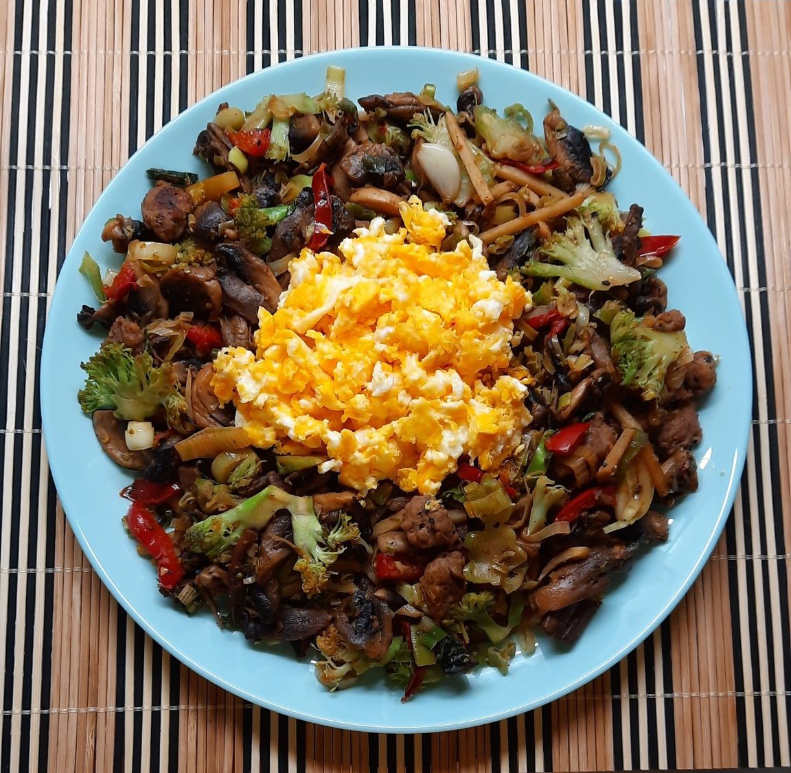Вчера- измислено люто китайско с бъркани яйца, зеленчуци, бамбук и...кебапче😆 на късчета: