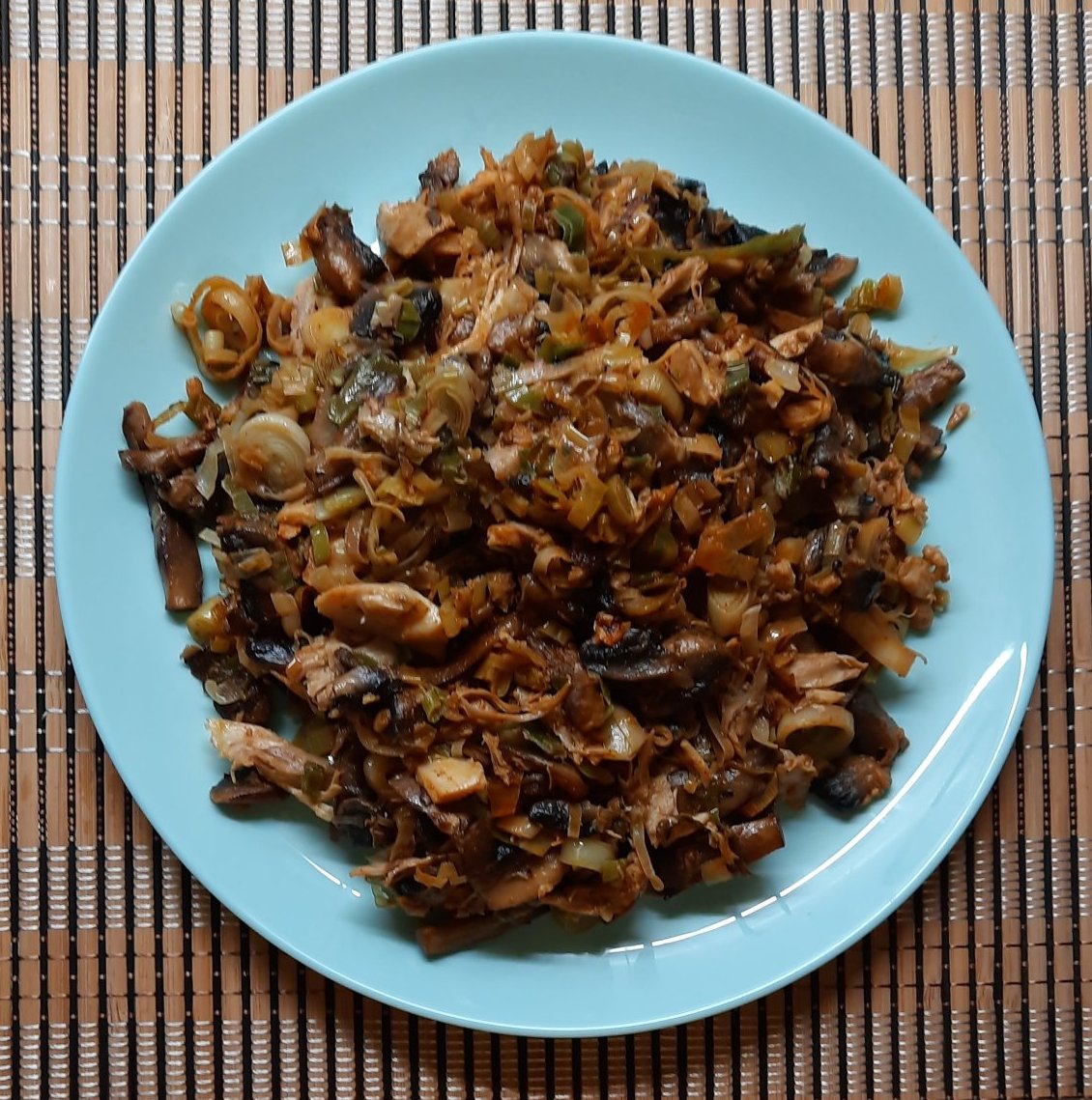 Днес- "дърпано" пиле с гъби, зелен лук, праз и сметана: